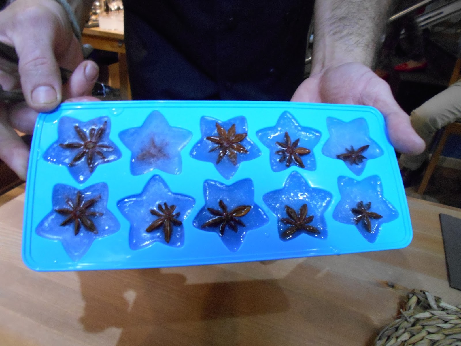 Anis Tenis, Agua con gas, un precioso y llamativo cubito con agua de coco y anis estrellado y, 1 berberecho como toque final