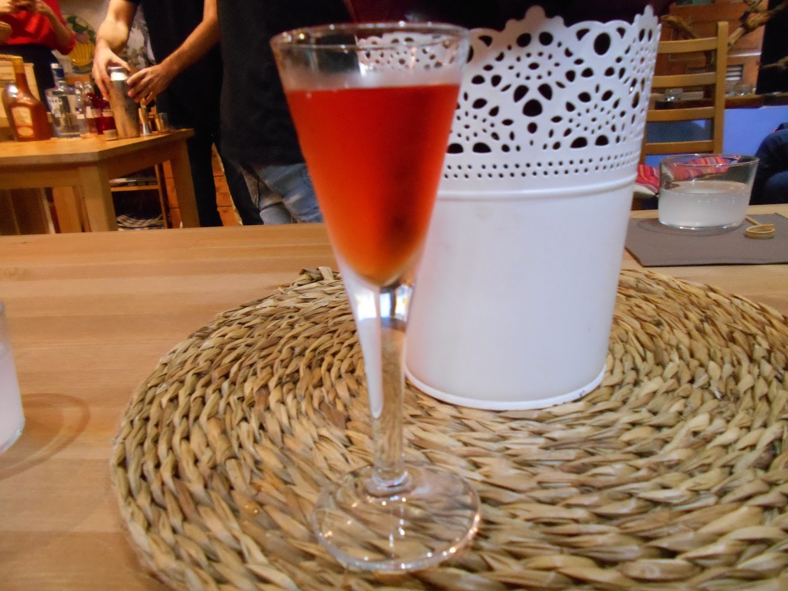 Nuevo cóctel sin nombre (yo he propuesto ROJO ALICANTE haciendo alusión a algo tan alicantino como el mármol que recibe dicho nombre y decora uno de los emblemas alicantinos por excelencia como es la Explanada). Lleva: Anis licor de mandarina, Ginebra, Bitter. Fue expectacular yo sin duda me lo pediria. Estaba riquisimo y con todos los sabores en su justa medida