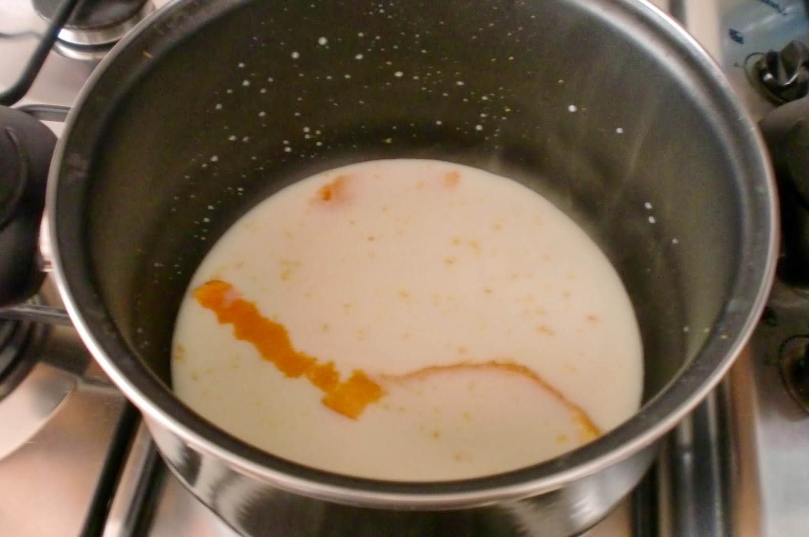 Cogemos la mitad de la leche y la ponemos en un cazo a calentar, junto con la piel del limon o naranja, el azucar y la vainilla.