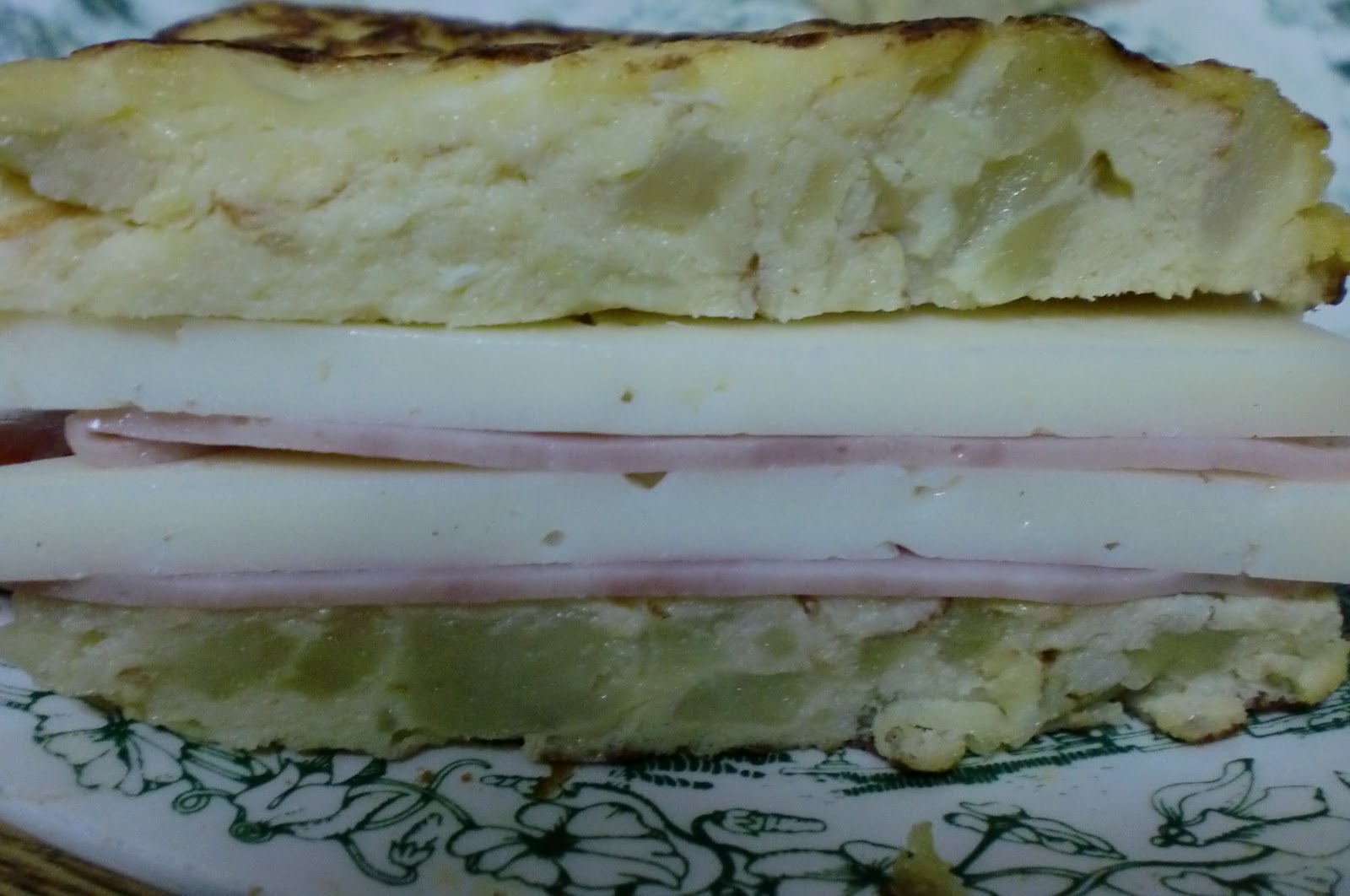 Tortilla de patata con jamón york y queso. La lonchas de jamón y queso se echan entre la mezcla de la patata y el huevo. O bien una vez hecha la abrimos por la mitad y la rellenamos