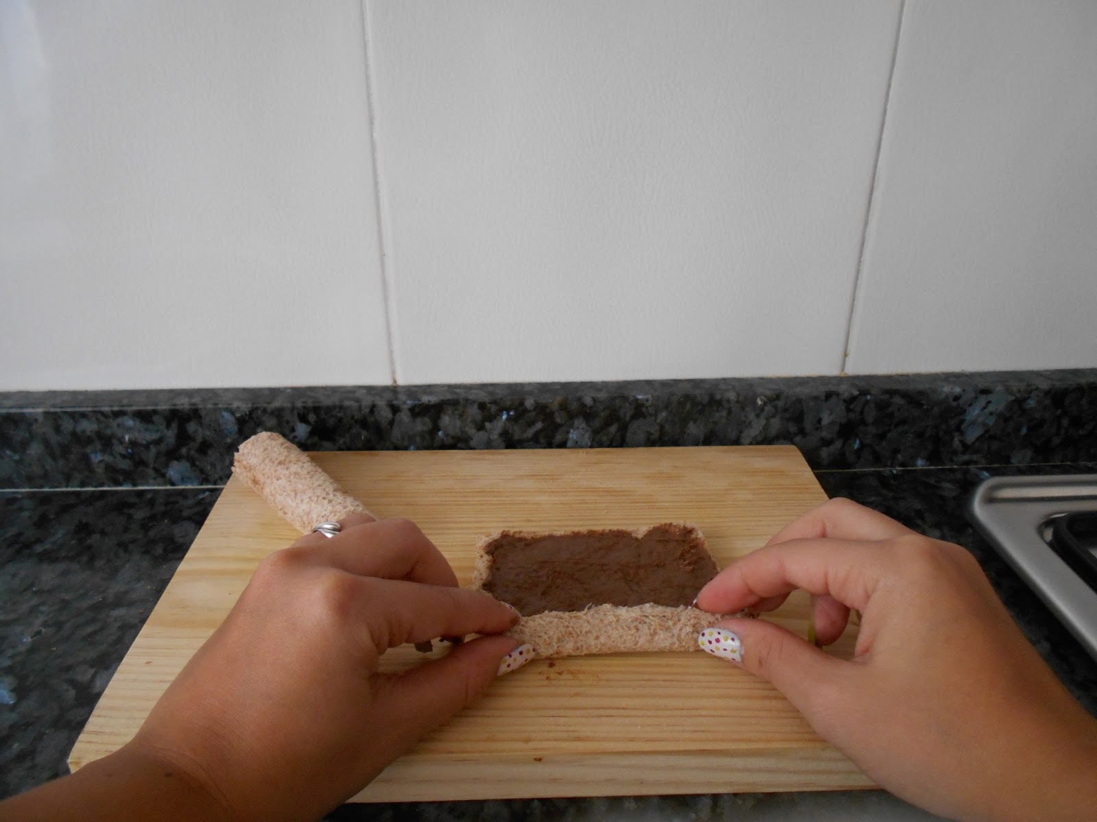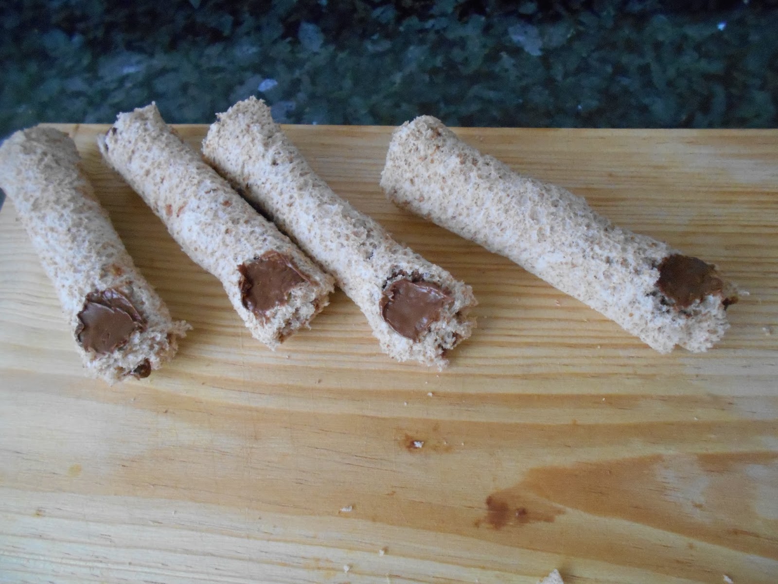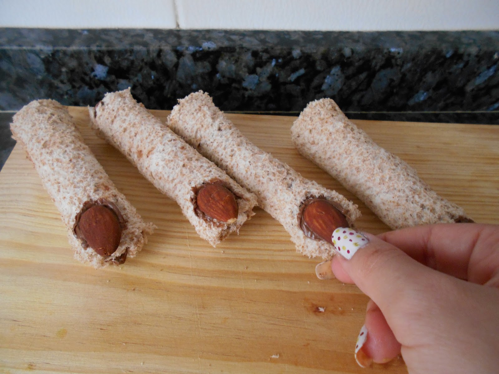 Ponemos en uno de los extremos un poco mas de crema de cacao, nos servira para que la almendra no se caiga y le dara aspecto de suciedad al dedo.