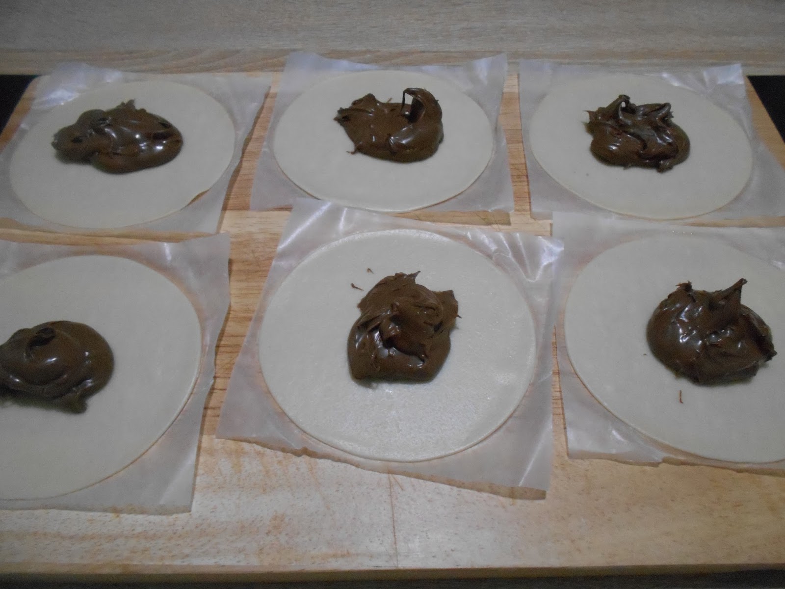 Ponemos un poco de crema de chocolate en el centro. Sed generosos, pero no en exceso, para evitar que se salga el relleno.