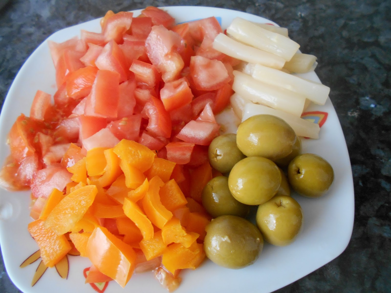 Cortamos los ingredientes de la ensalada, salvo las aceitunas.