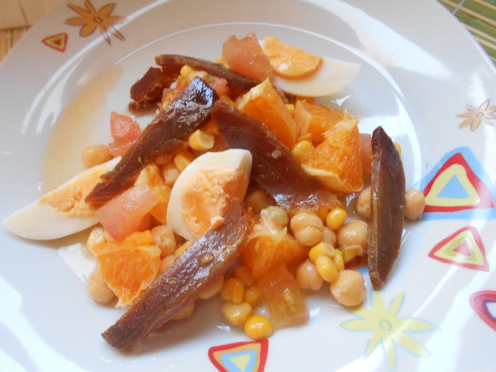 En esta ocasion la he hecho con garbanzos y mojama y para darle un toque más fresco naranja.
