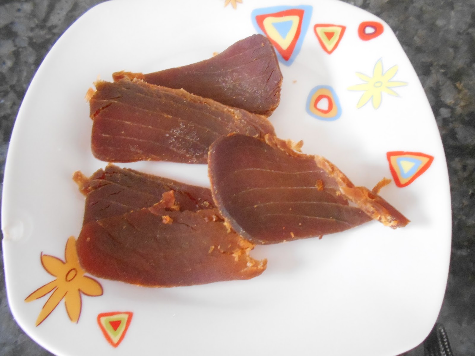 La mojama es un salazon del atun. Mojama proviene del nombre árabe musama, quienes curaban el atún cubierto de sal al oreo, al sol, con el fin de conservar un preciado alimento.