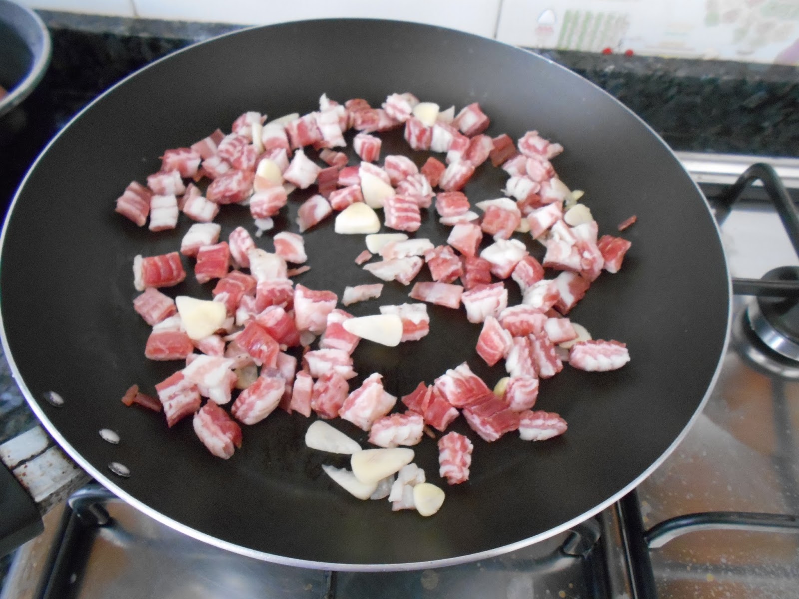 Salteamos el bacon con los ajos en laminas, yo no le pongo aceite porque con la grasita que sueltan es suficiente.