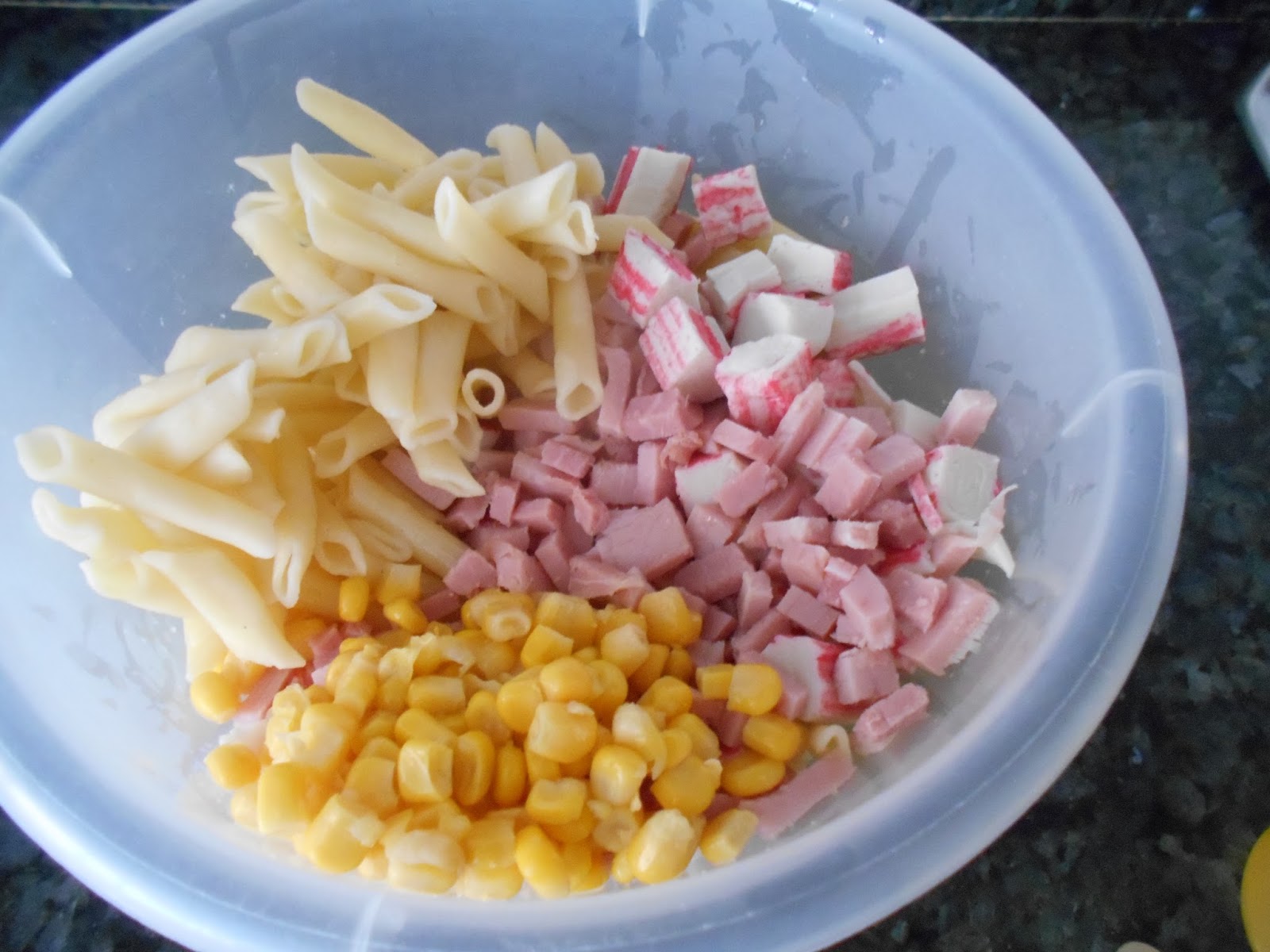 Añadimos el jamon, el maiz, las aceitunas y los palitos.  Yo el queso y el tomate lo echo al momento para que no suelte agua en la ensalada