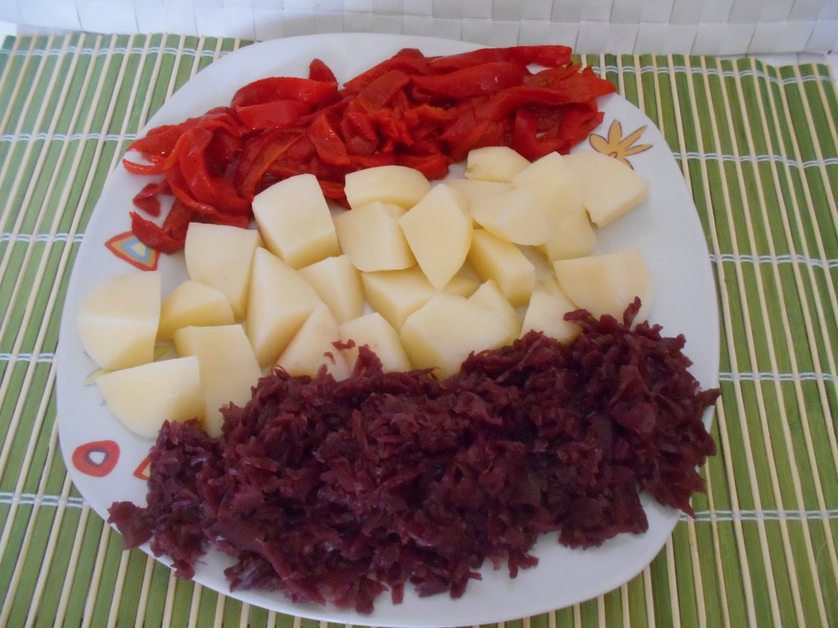 Hoy os comparto esta ensalada totalmente vegetariana especial para aquellos que teneis una dieta que siga esa linea. En esta ocasion es de col lombarda, patatas y pimientos. Queda super rica tanto en frio como templada esta ensalada.
