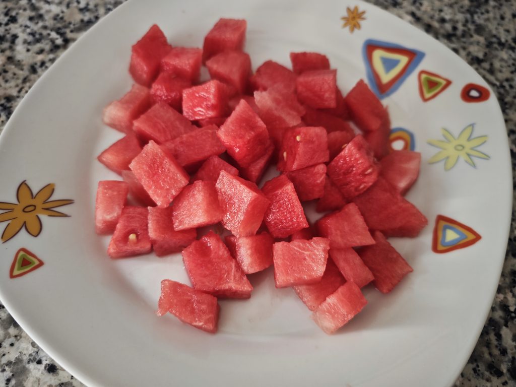 Lo primero es cortar la sandía, yo he preparado esta receta para dos personas, he cortado en dados un par de tajadas. Si la quieres hacer más vistosa puedes usar sacabolas (aunque se desperdicia más por eso yo la hago a trocitos)