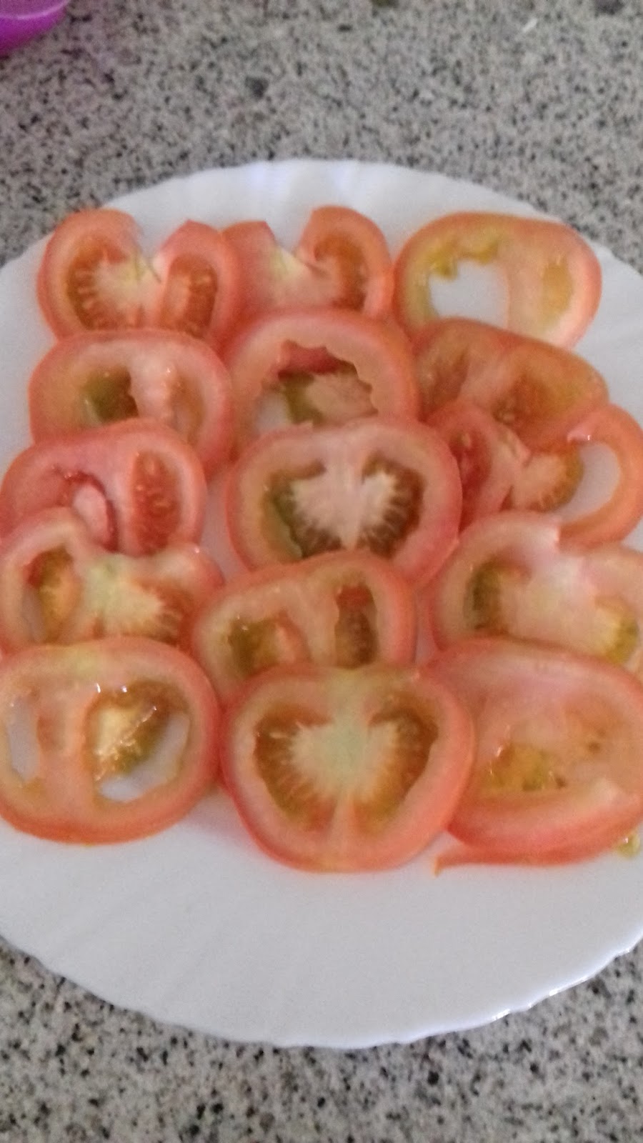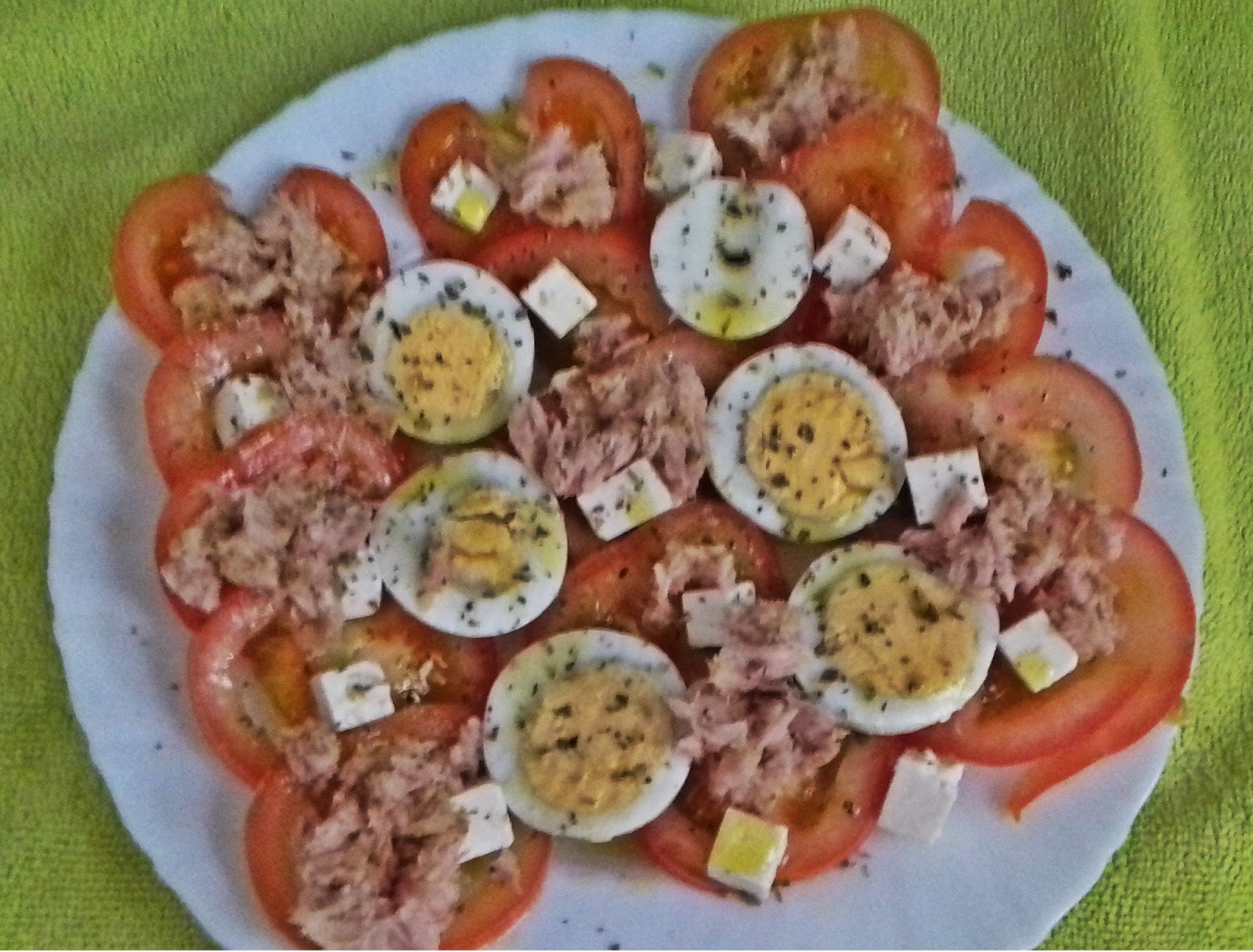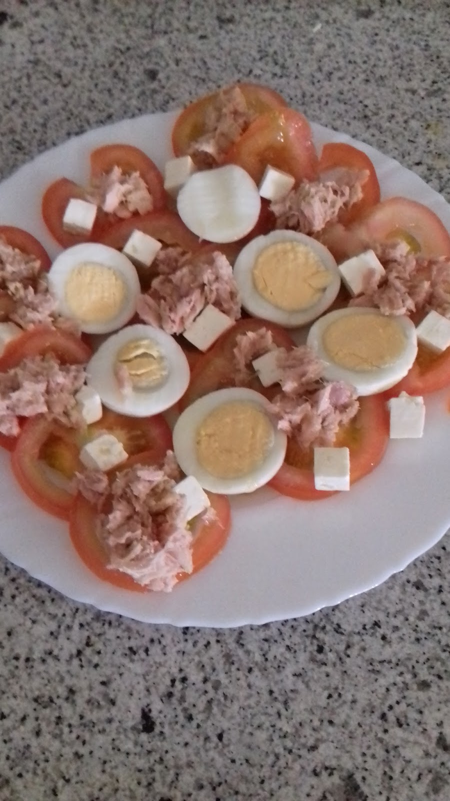 Cortamos los huevos cocidos en rodajas y las disponemos sobre el tomate junto con los tacos de queso feta.