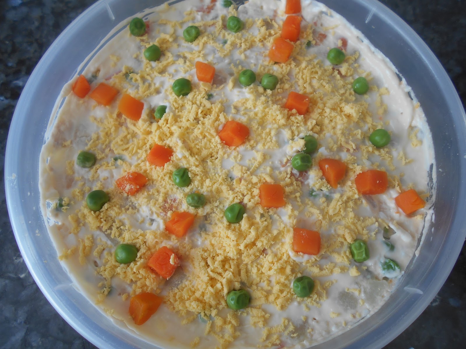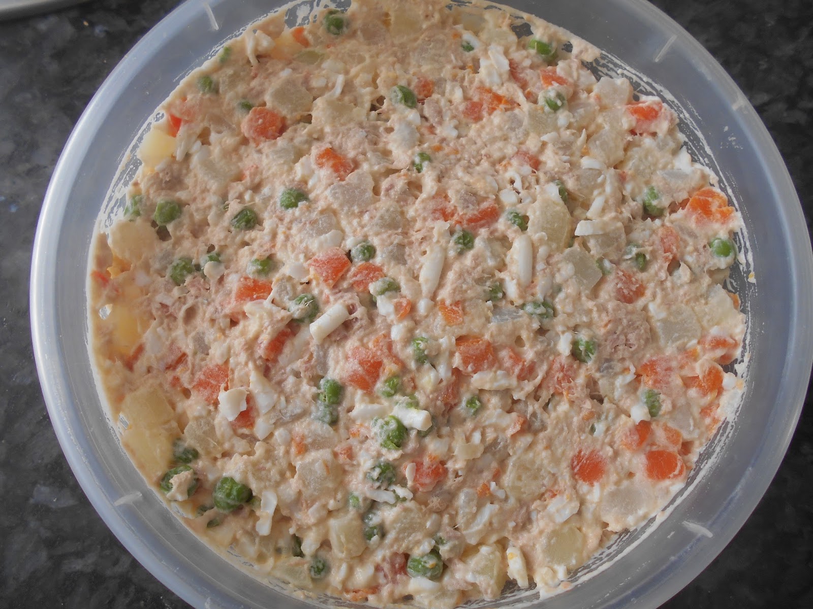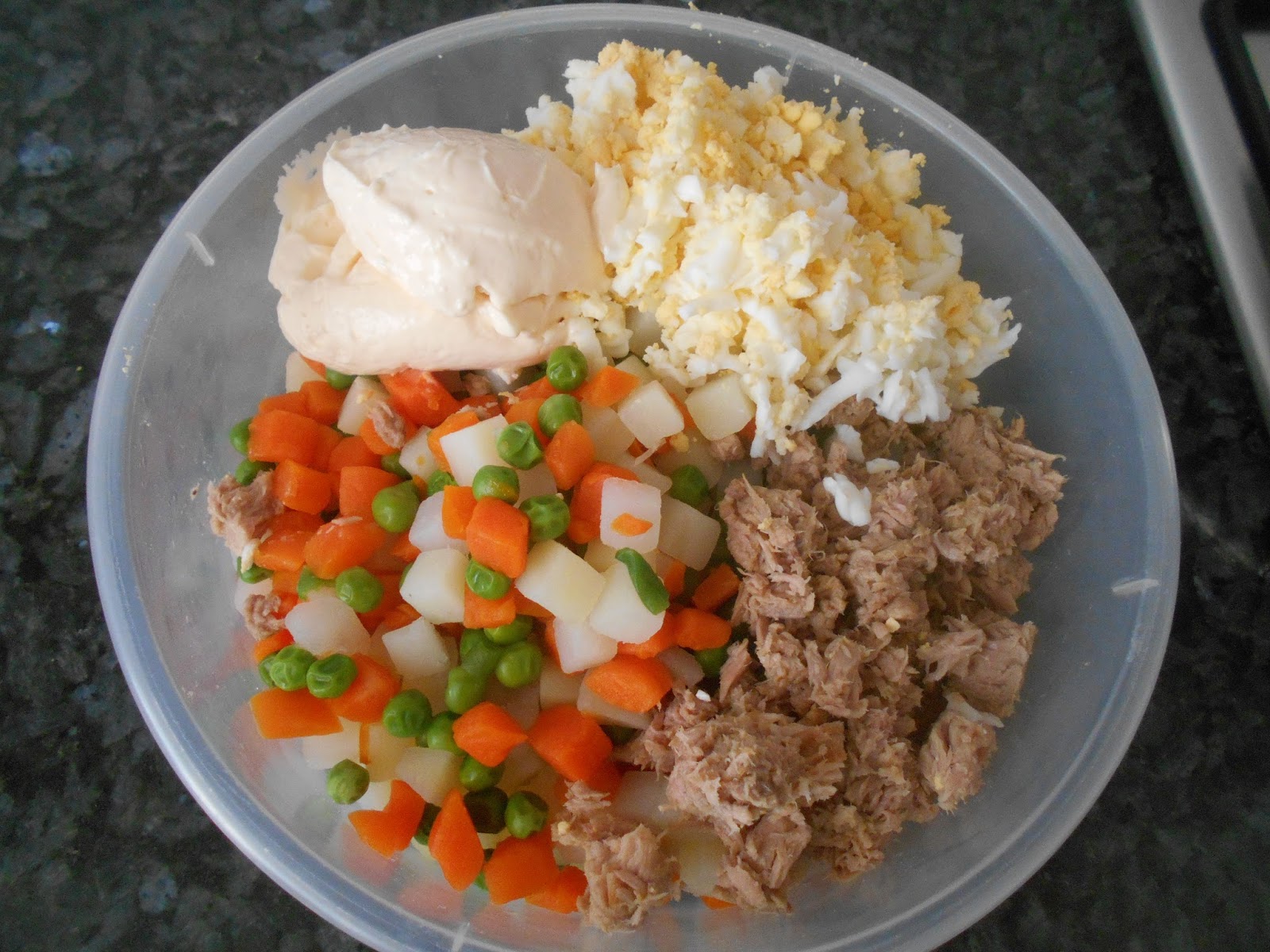 En un recipiente echamos la menestra y añadimos el atun, los huevos y la mahonesa