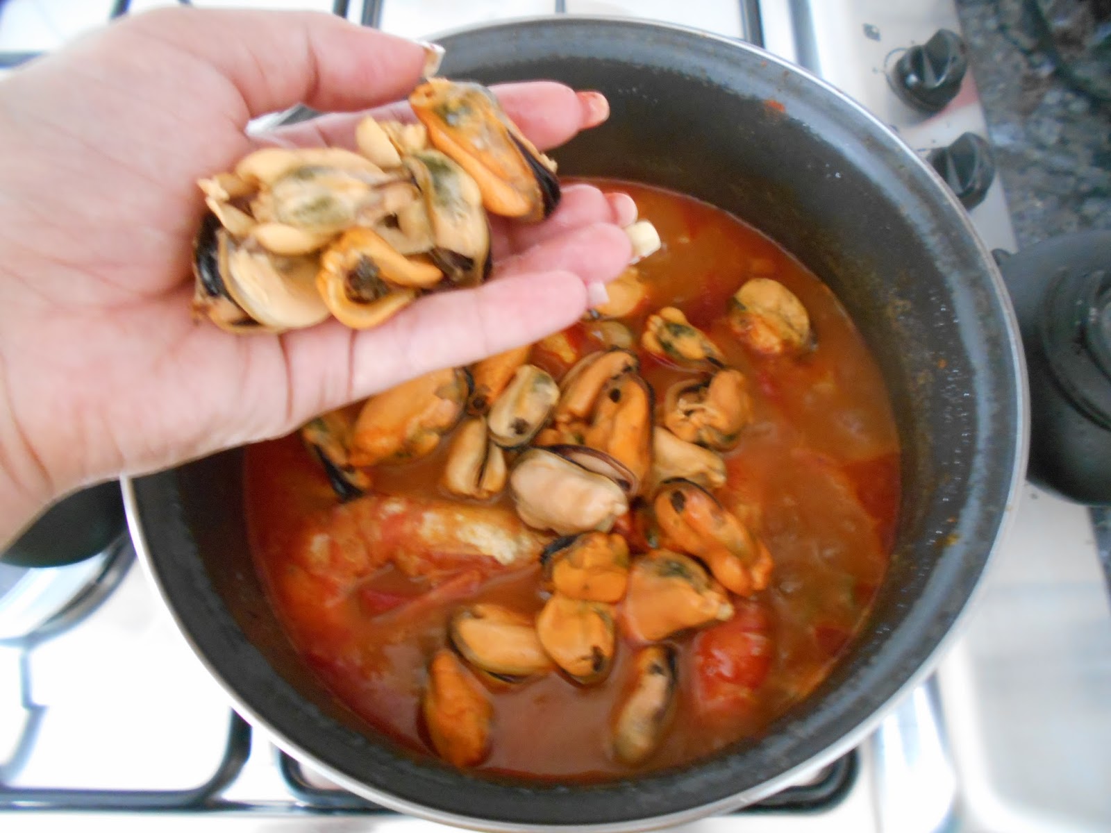 apagamos el fuego y añadimos los mejillones.