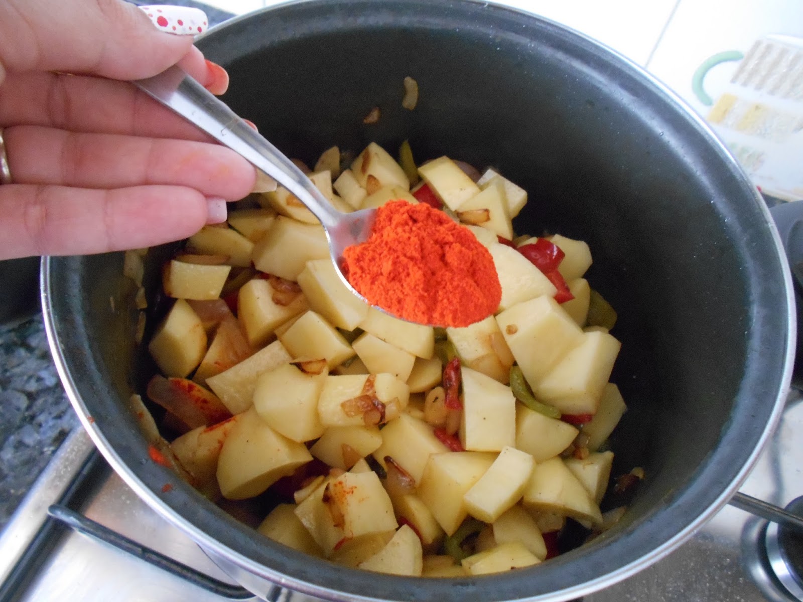 Echamos el pimenton y rehogamos ligeramente.