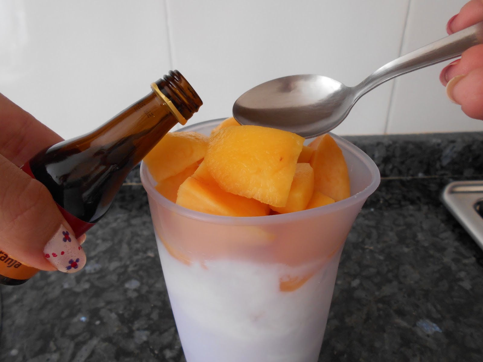 En un recipiente ponemos los melocotones junto con el limón, el licor, el yogur y la leche de coco.