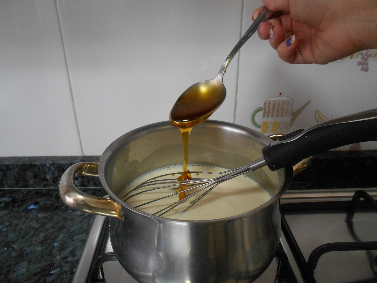 Retiramos los aromaticos y llevamos de nuevo al fuego. Añadimos la nata, las yemas y la miel o el azucar. Mezclamos muy bien.