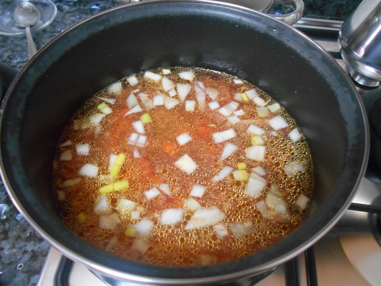 Echamos en una olla todo en crudo (salvo el arroz). La cebolla y las zanahorias picadas y el tomate rallado