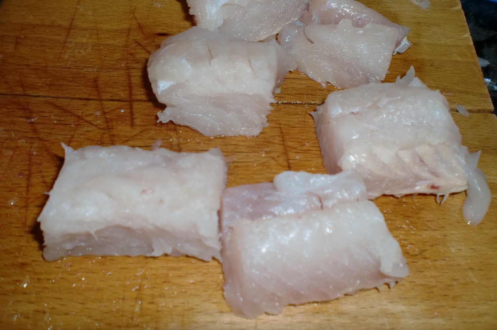 Cortamos la merluza en tacos, limpia de espinas y piel.
