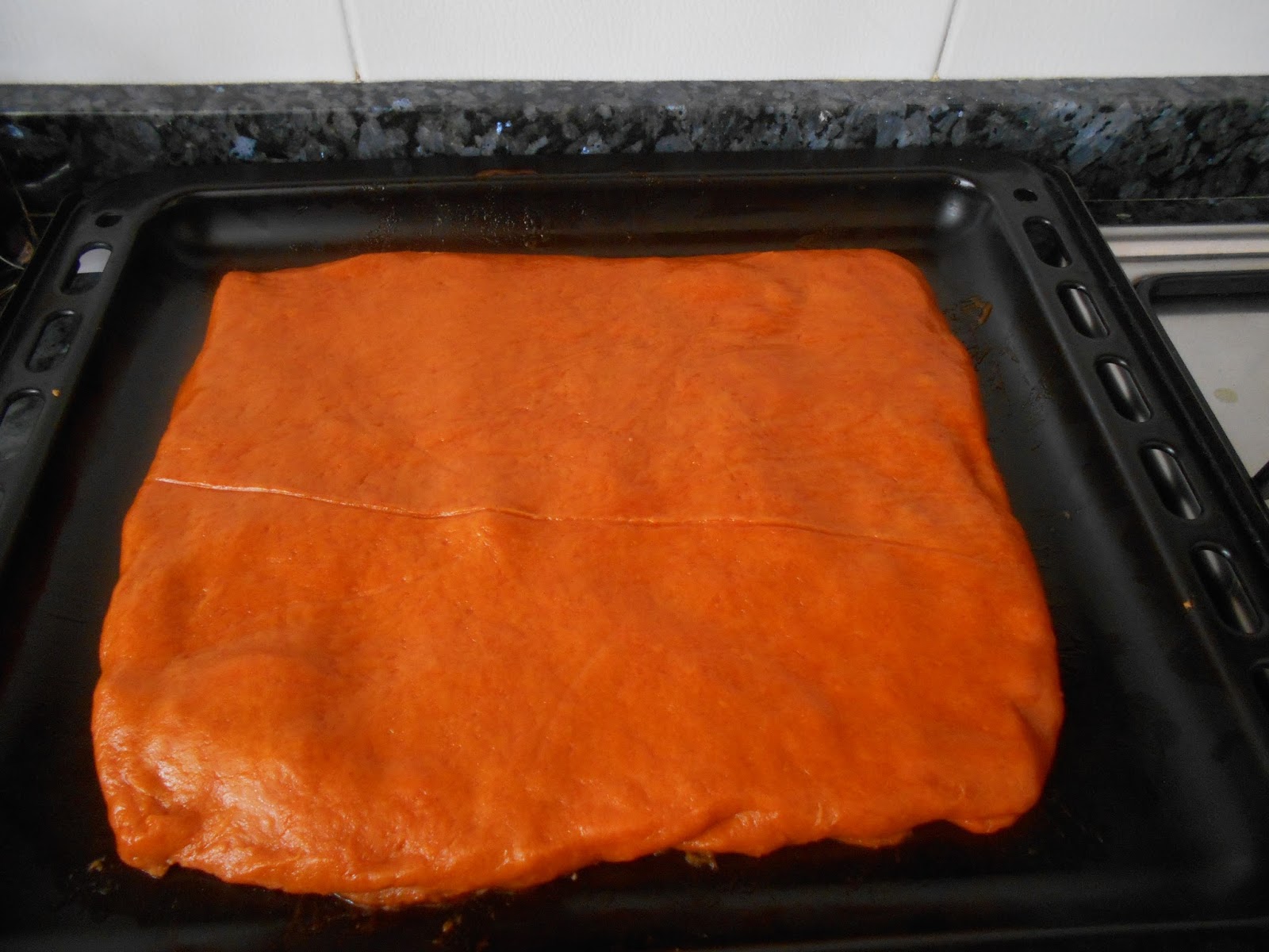 Ponemos la mitad de la masa (la más pequeña) en una bandeja de horno (si quereis podéis poner un poco de papel de hornear pero no es necesario)