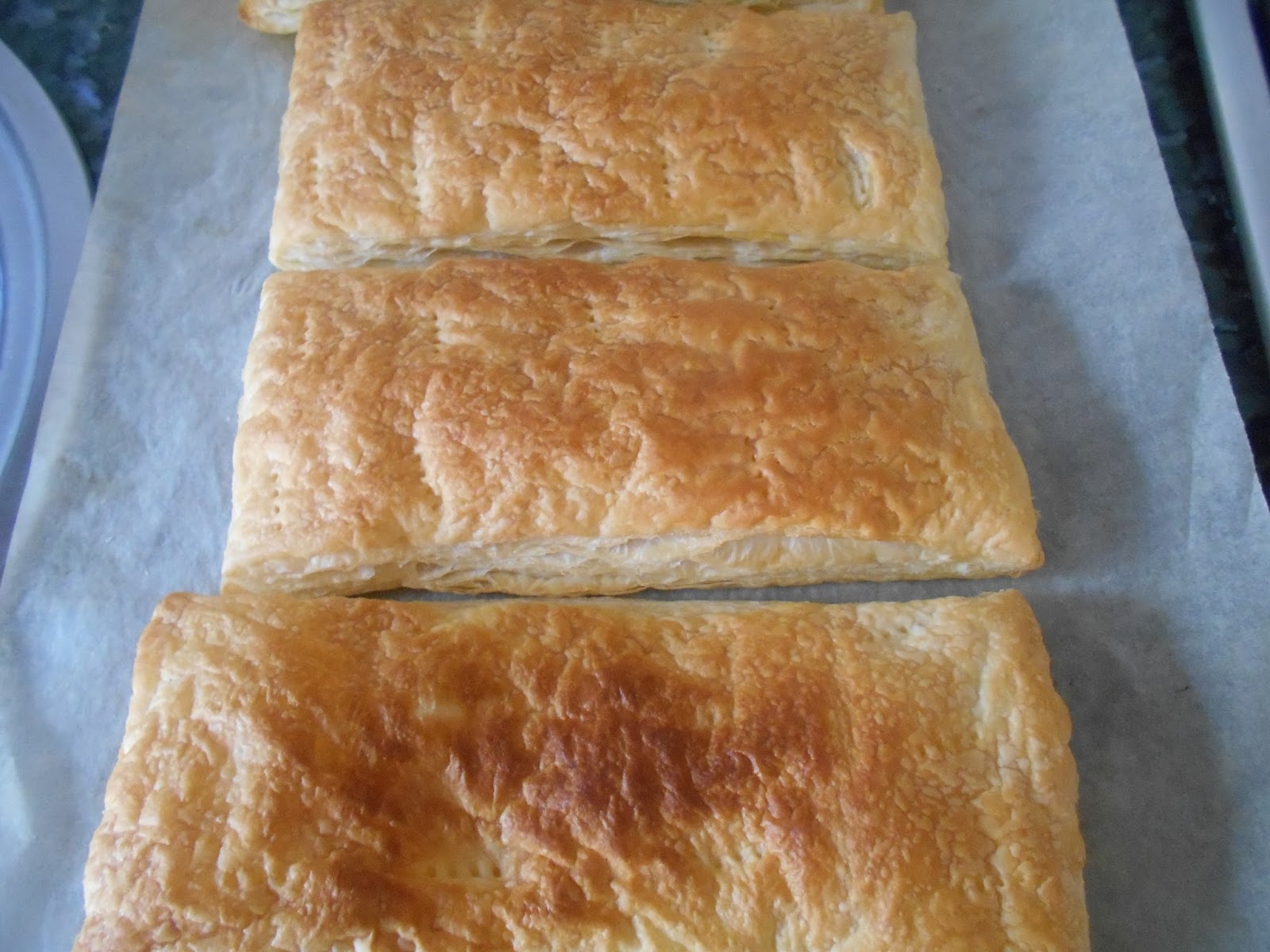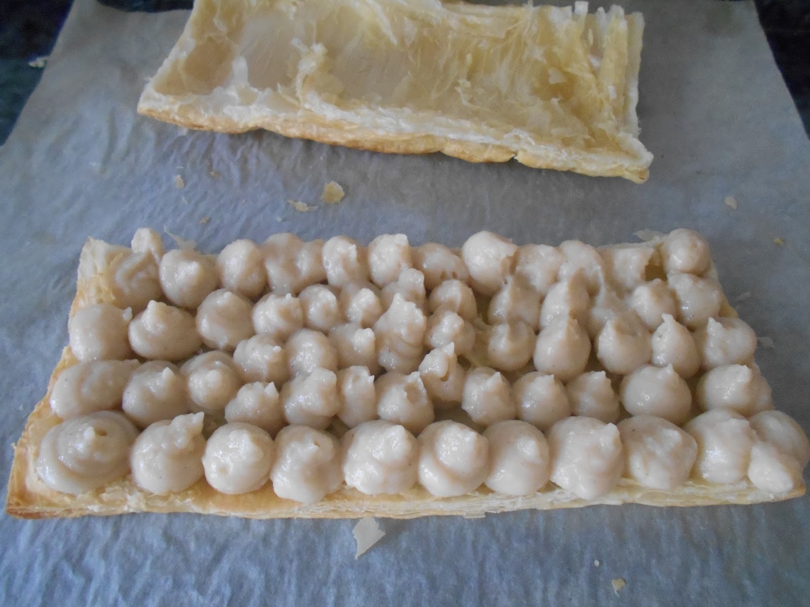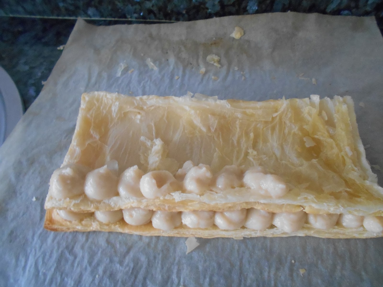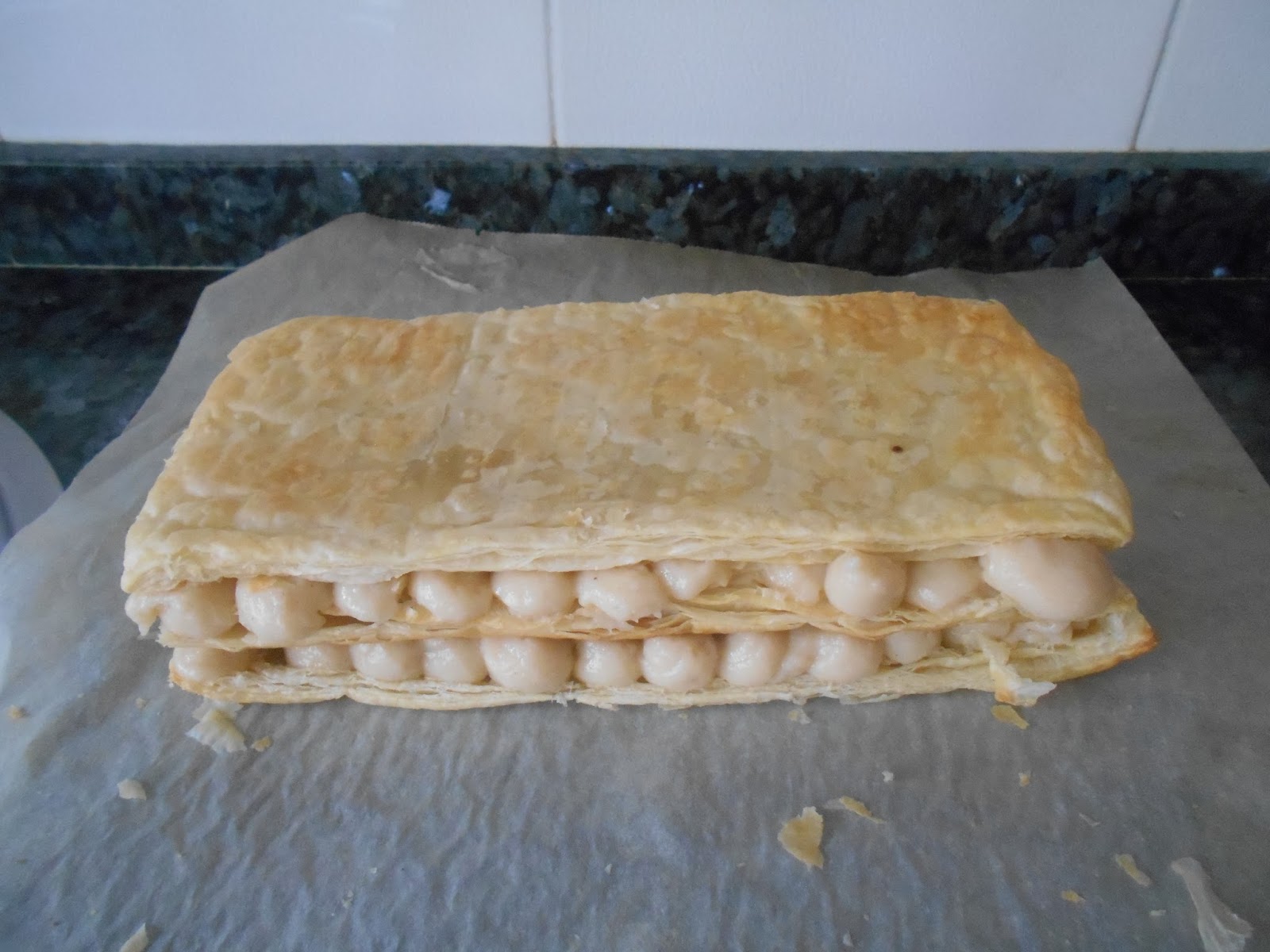 Vamos poniendo capas de hojaldre y crema pastelera.