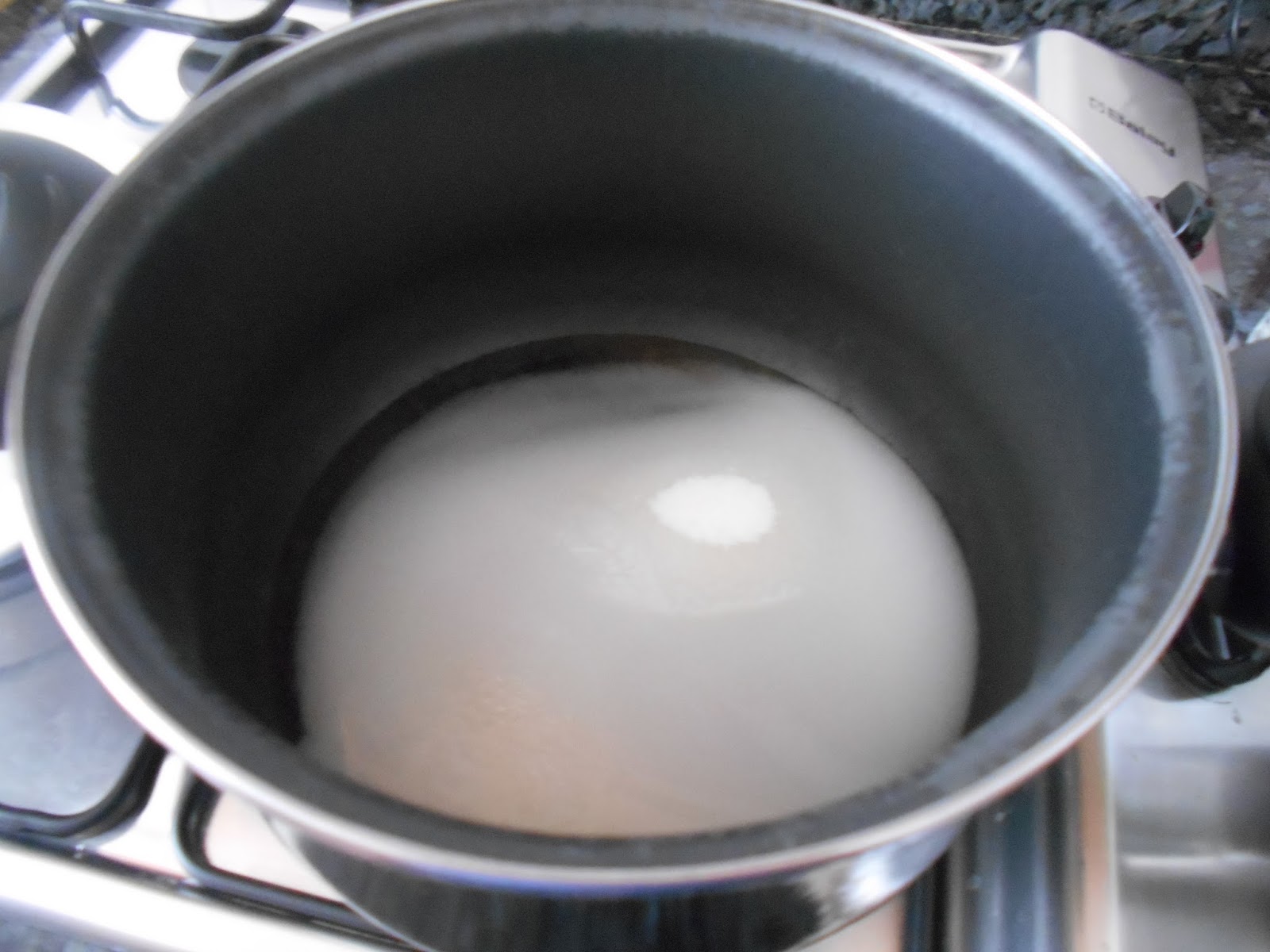 Echamos en una olla el agua y el azúcar, removemos para disolver el azúcar.
