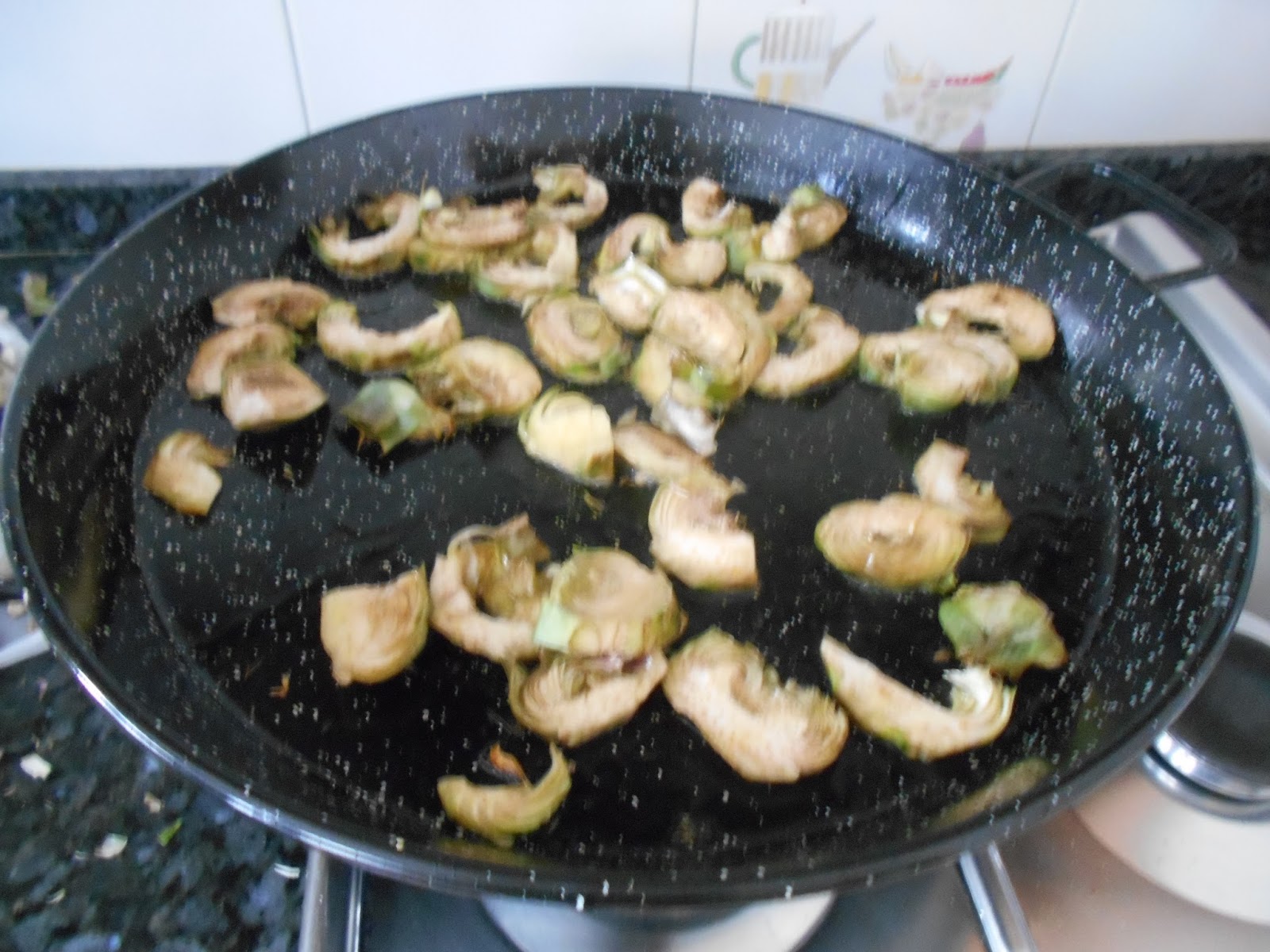Limpiamos muy bien las alcachofas y las cortamos en laminas finas. En la paella, con un buen chorro de aceite sofreimos las alcachofas.