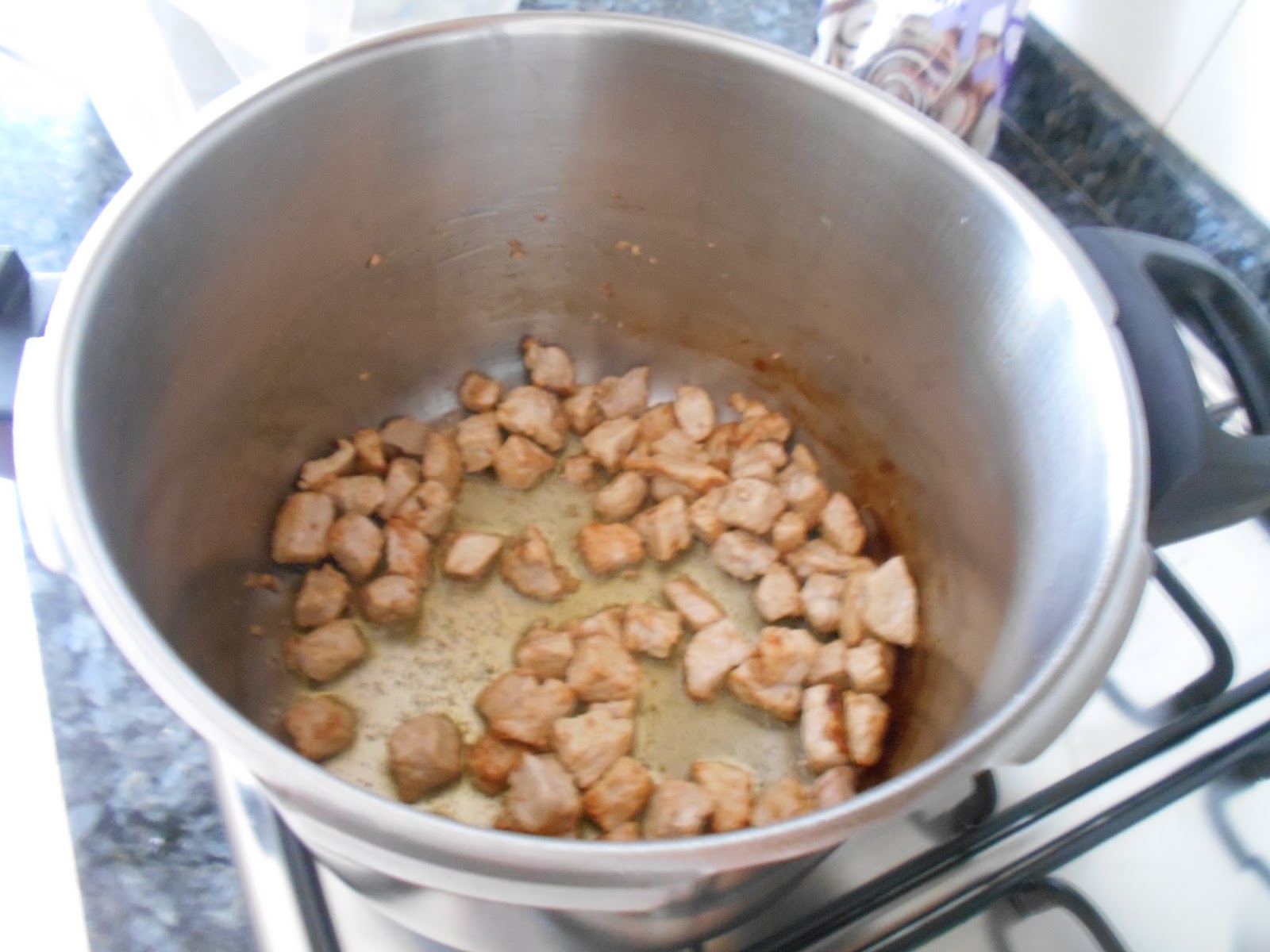 lo primero que debemos hacer es freir en una olla expres con aceite los trocitos de magra.