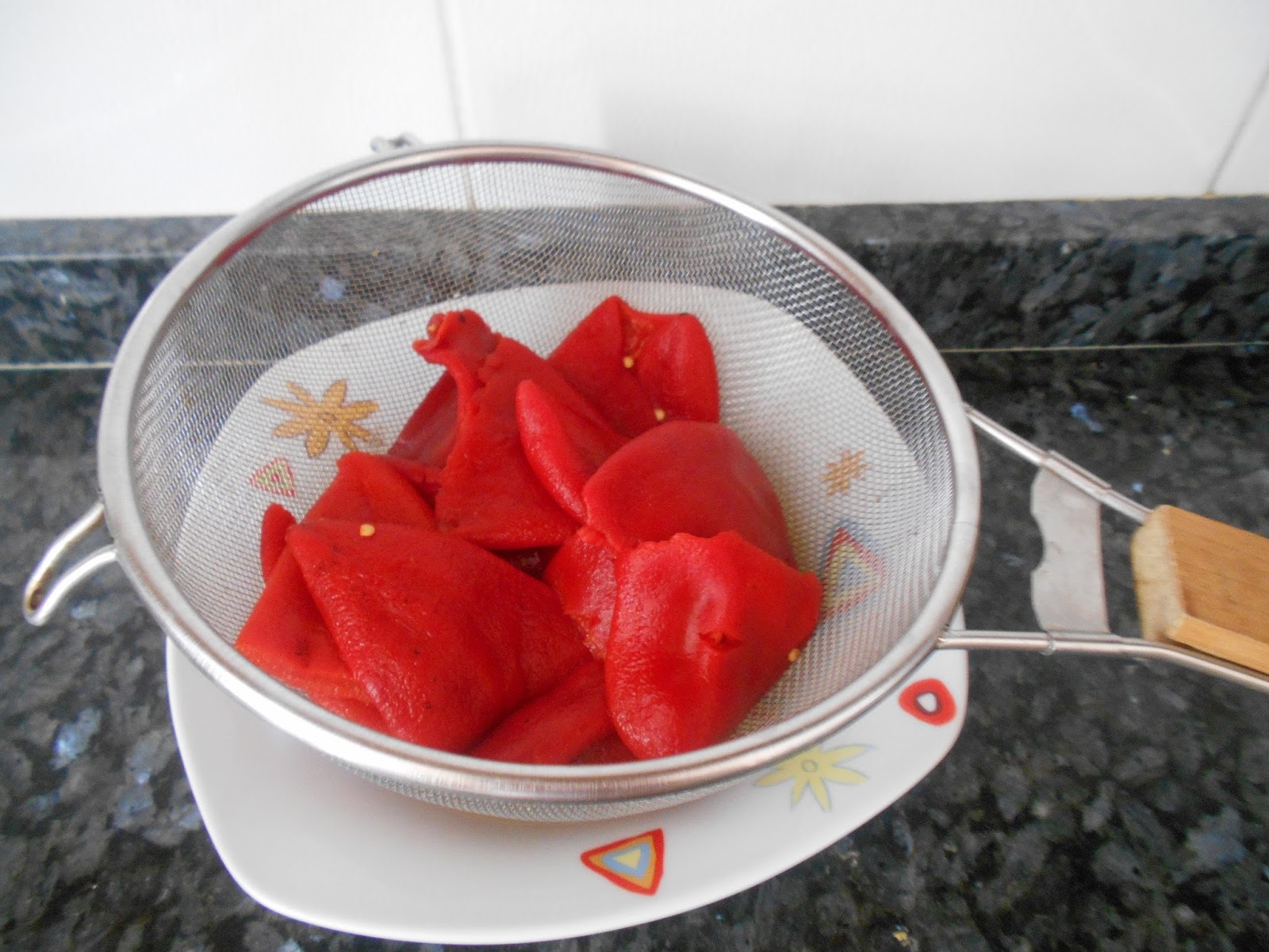 escurrimos los pimientos muy bien, este tarros traia ajos, los usé para el relleno