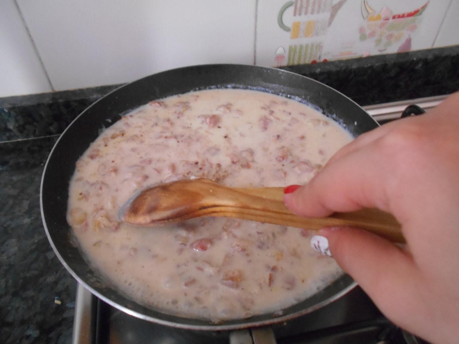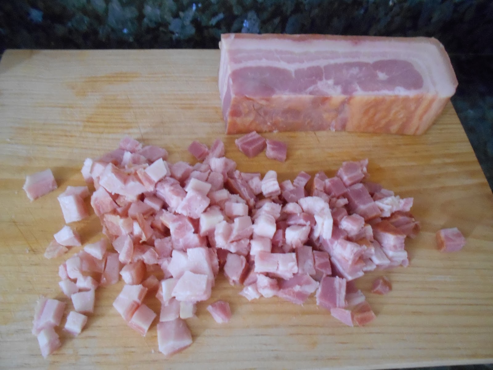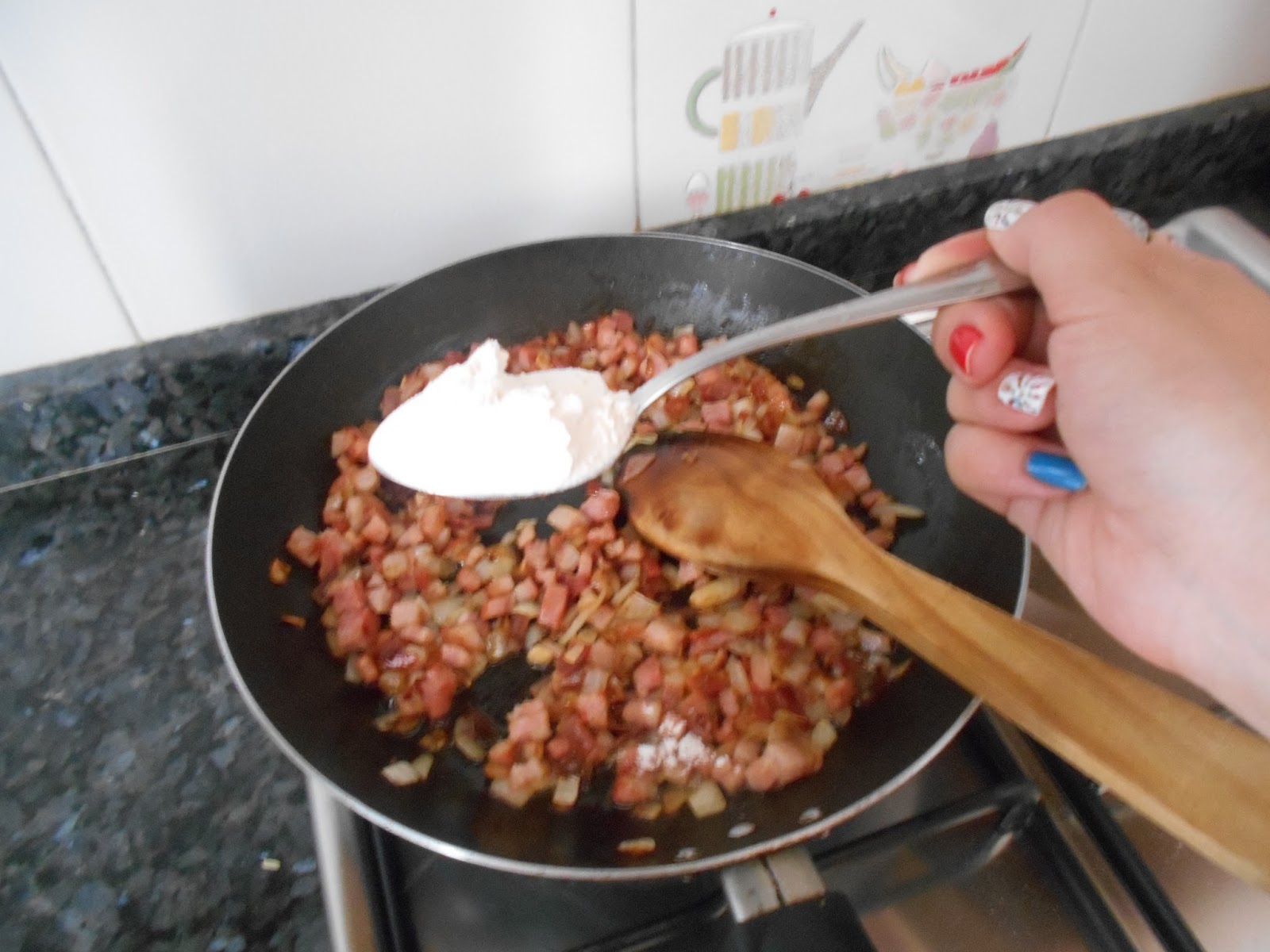 cuando la cebolla y los ajos estén pochados añadimos el bacon y el jamón y lo salteamos.