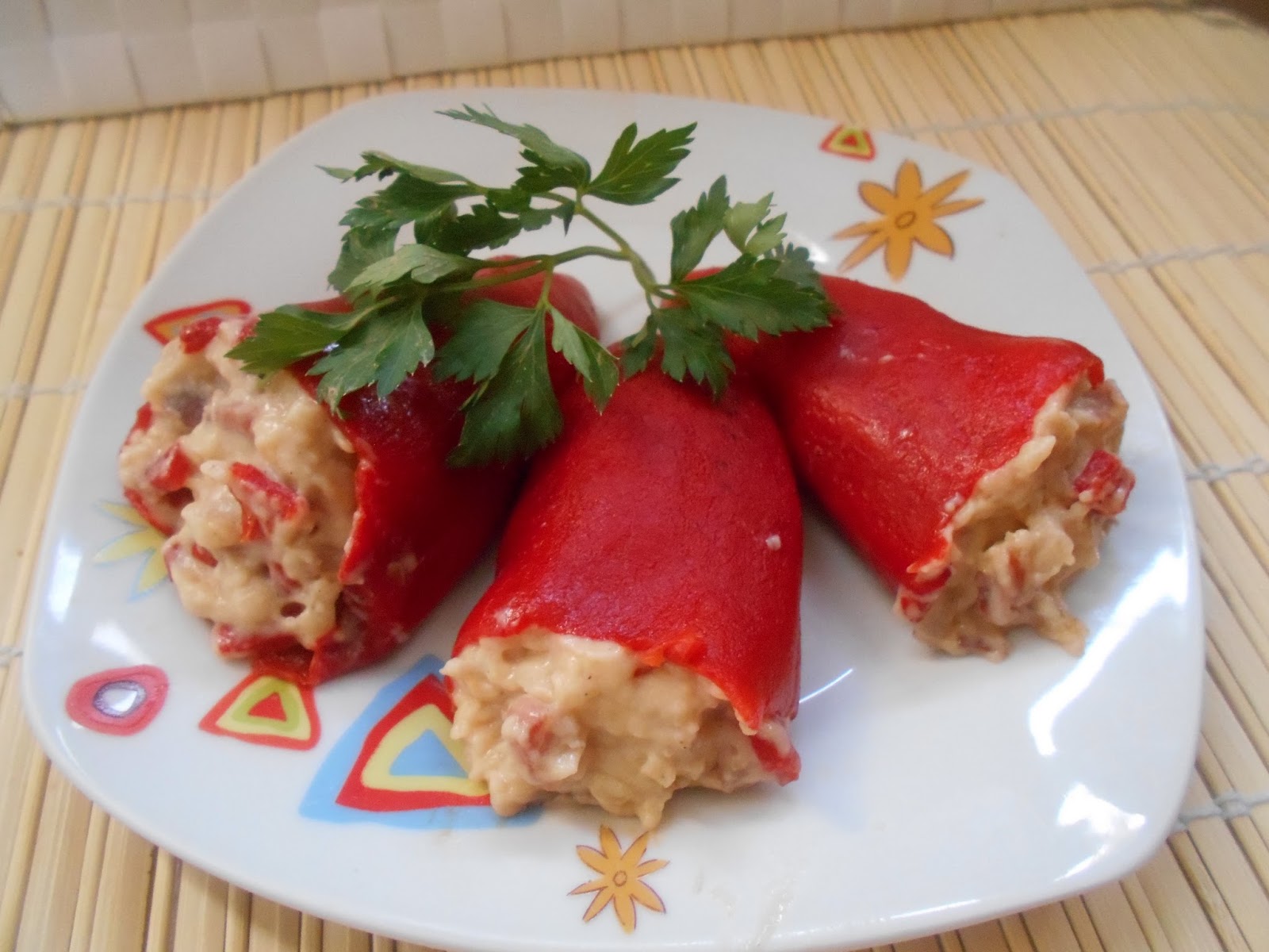 abrimos los pimientos y rellenamos con la ayuda de una cucharita o una manga pastelera