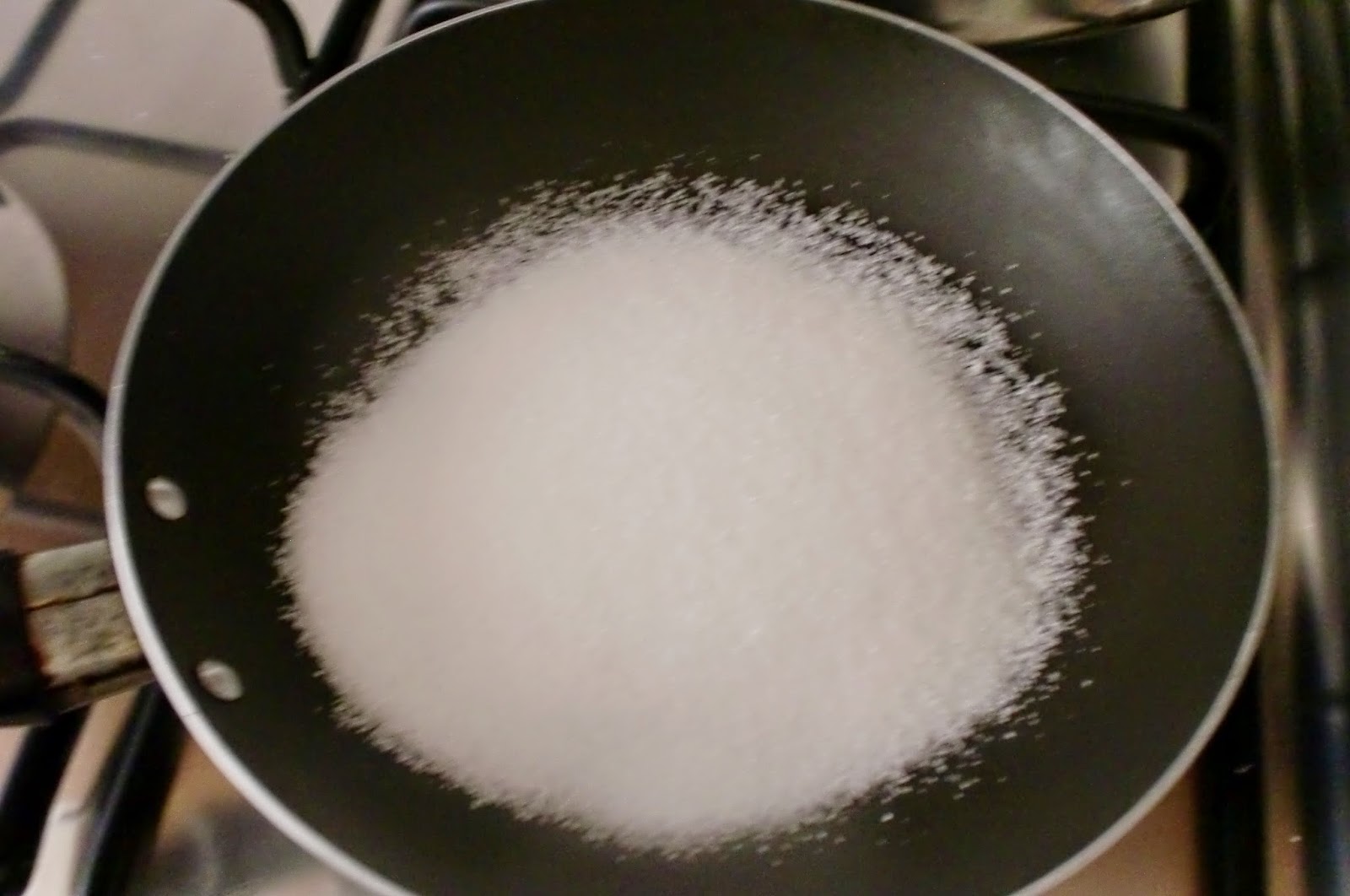 Lo primero que debemos hacer es preparar el caramelo. Para ello, en una sartén antiadherente, verteremos el azúcar sin nada más ( no es necesario) y lo dejamos que se caramelice hasta que coja un tono dorado pero no muy oscuro.