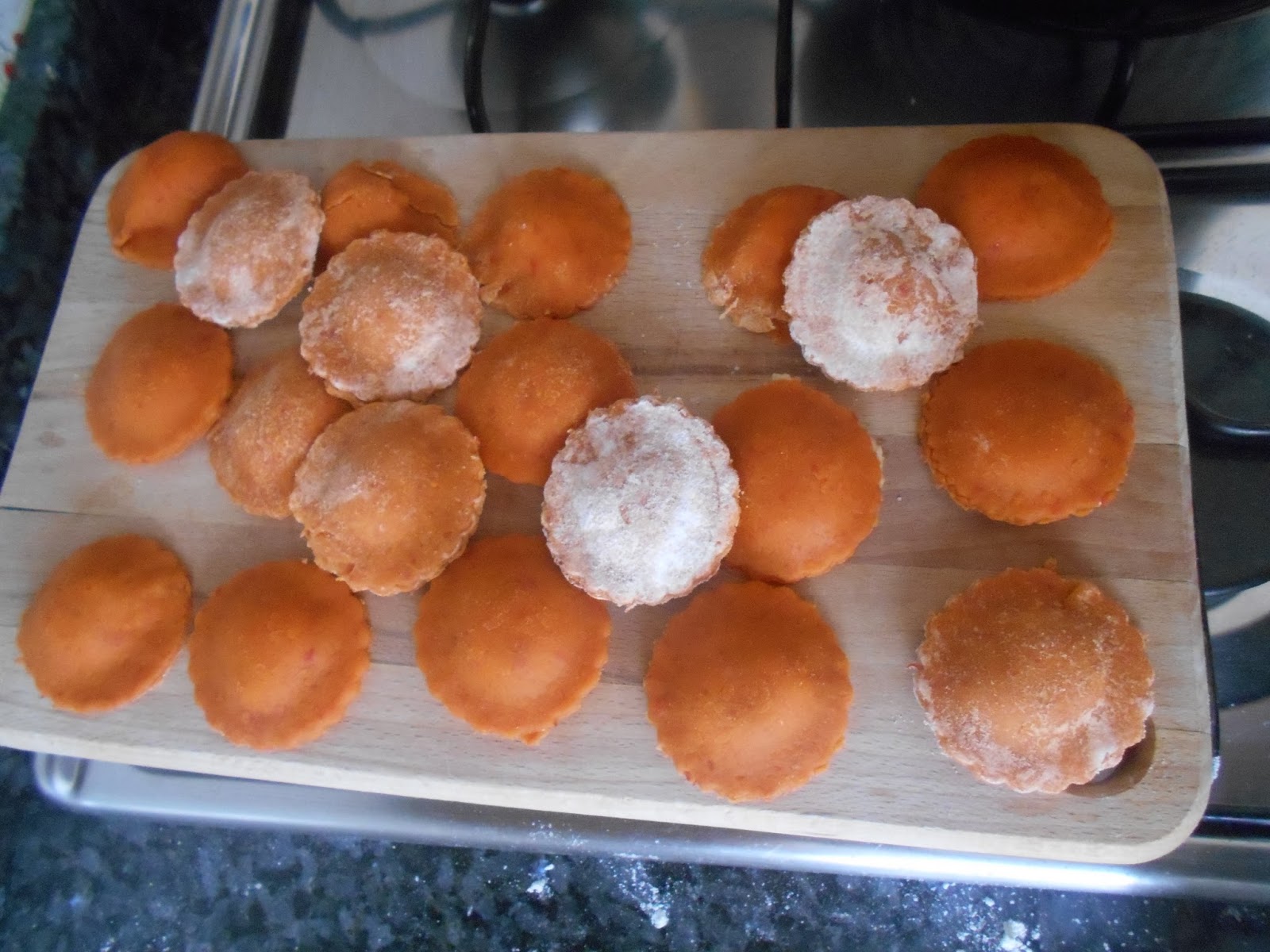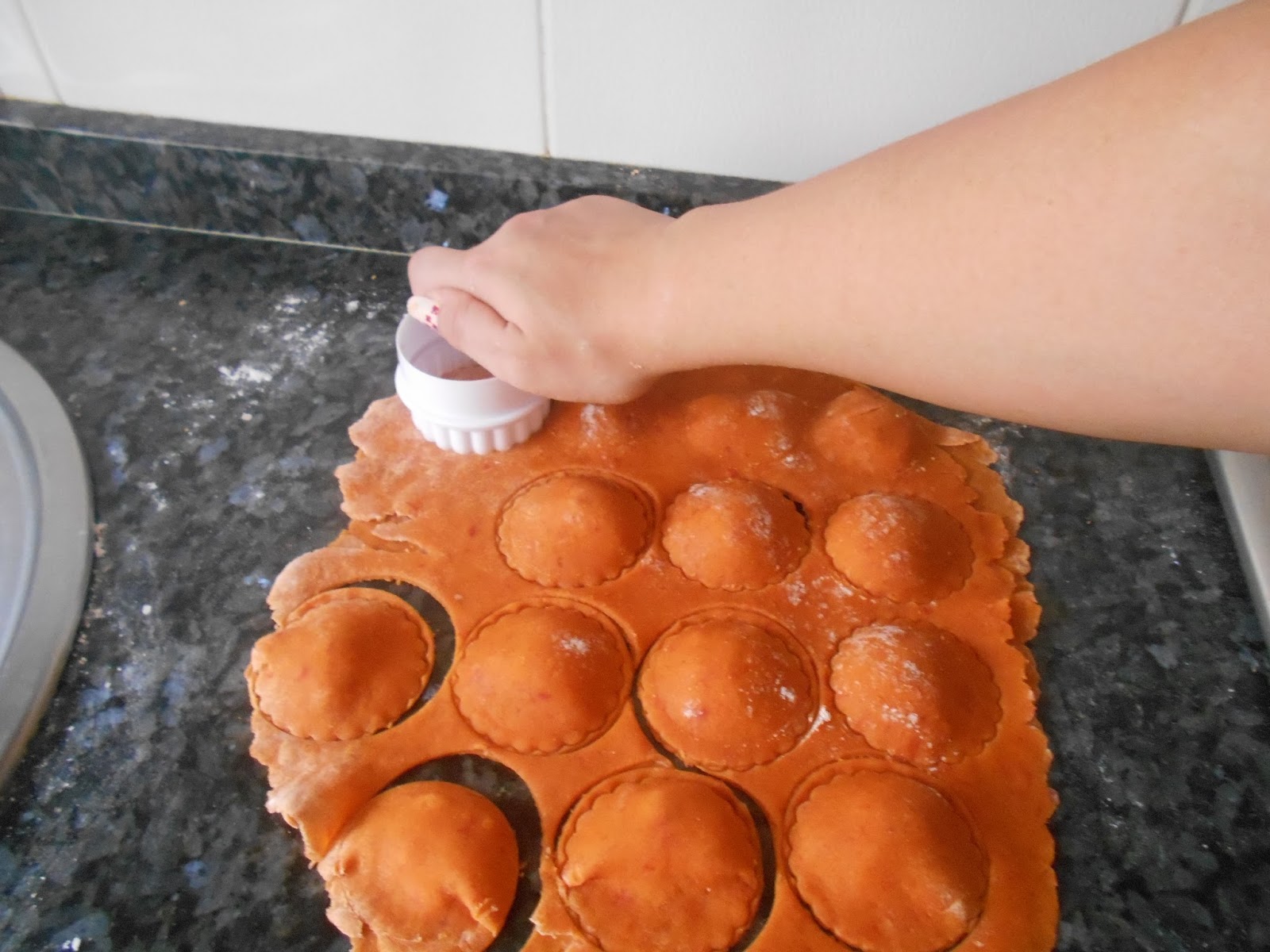 Con la ayuda de unos cortadores, cortamos los raviolis. Los raviolis como os decia son cuadrados pero hoy los he hecho así… redondos