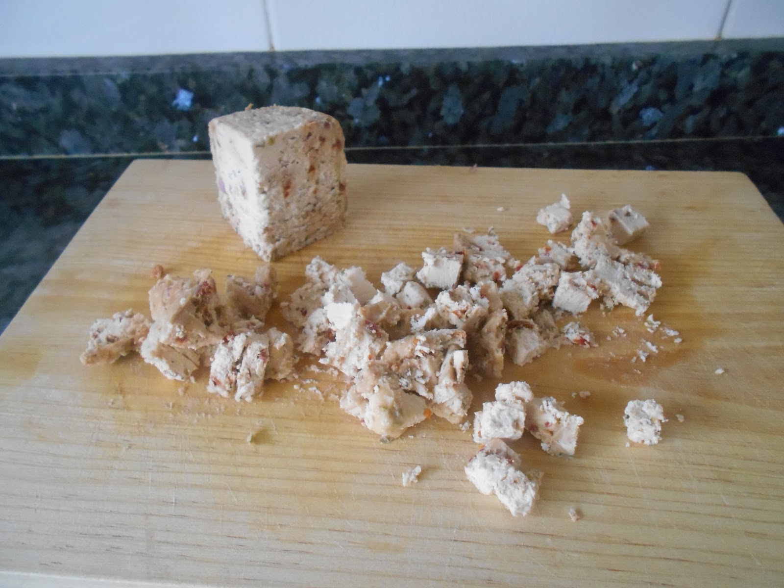 Picamos las almendras y las añadimos junto con el queso en un cuenco. Agregamos la cebolla que había reservado de la salsa.