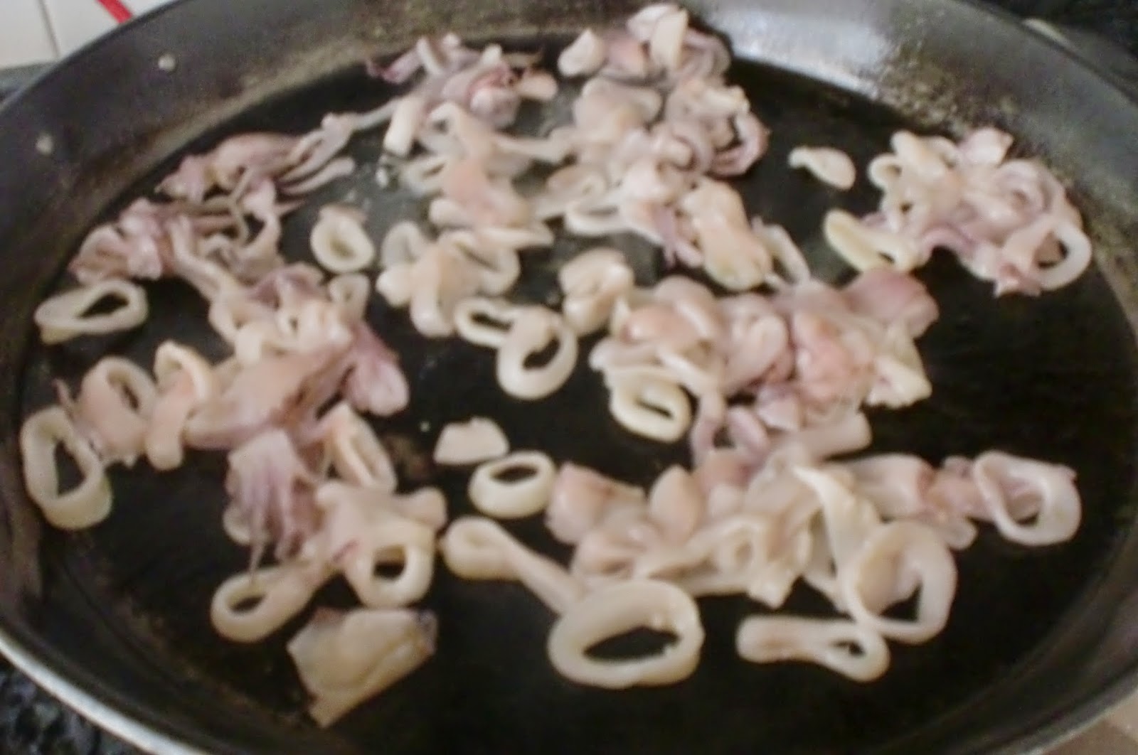 Empezaremos por sofreír en la misma paella todos los ingredientes para dejar en esta el sabor. Así que mientras tenemos marchando el fumet sofreiremos los calamares, sepia o pota lo que hayáis elegido. Yo dependiendo del día pongo una cosa u otra