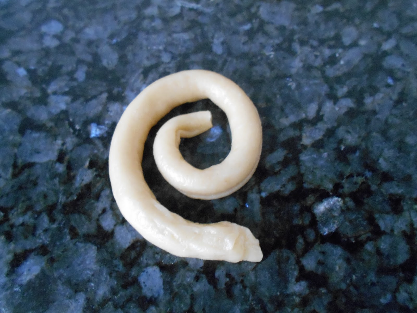 Se enrollan la masa haciendo un cilindro (como si fuera un puro) y se le da la forma de ensaimada. Dejad espacio entre las vueltas porque luego se cerrarán.