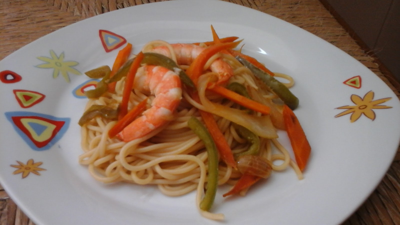 ESPAGUETIS CON VERDURAS Y LANGOSTINOS ESTILO CHINO