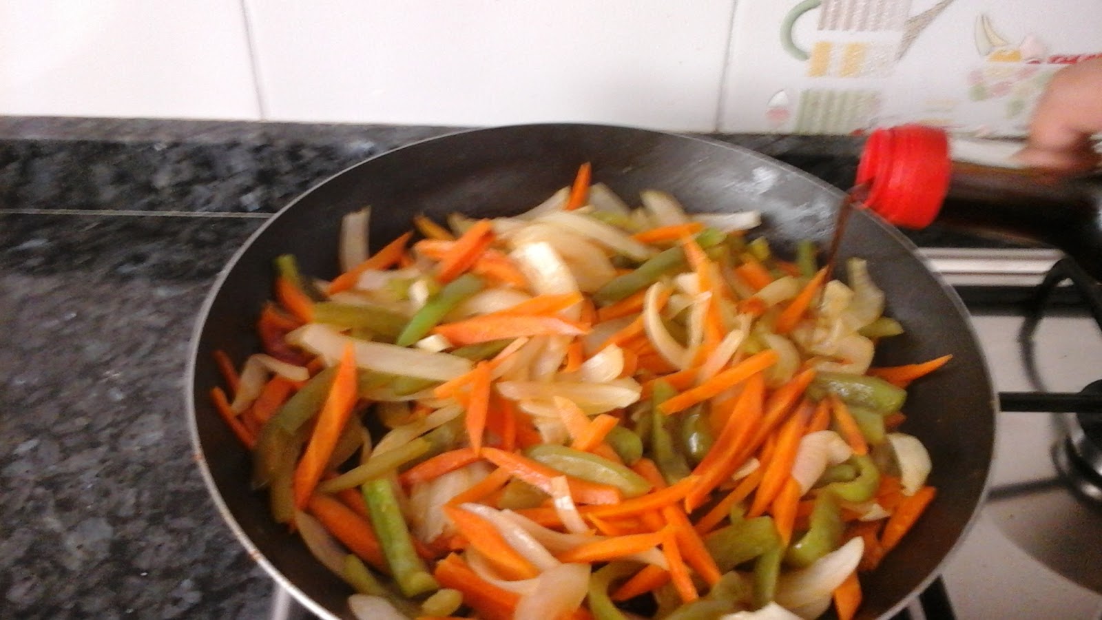 En esa misma sartén con un poco de aceite y salteamos las verduras. Es mejor que queden no demasiado pochadas.