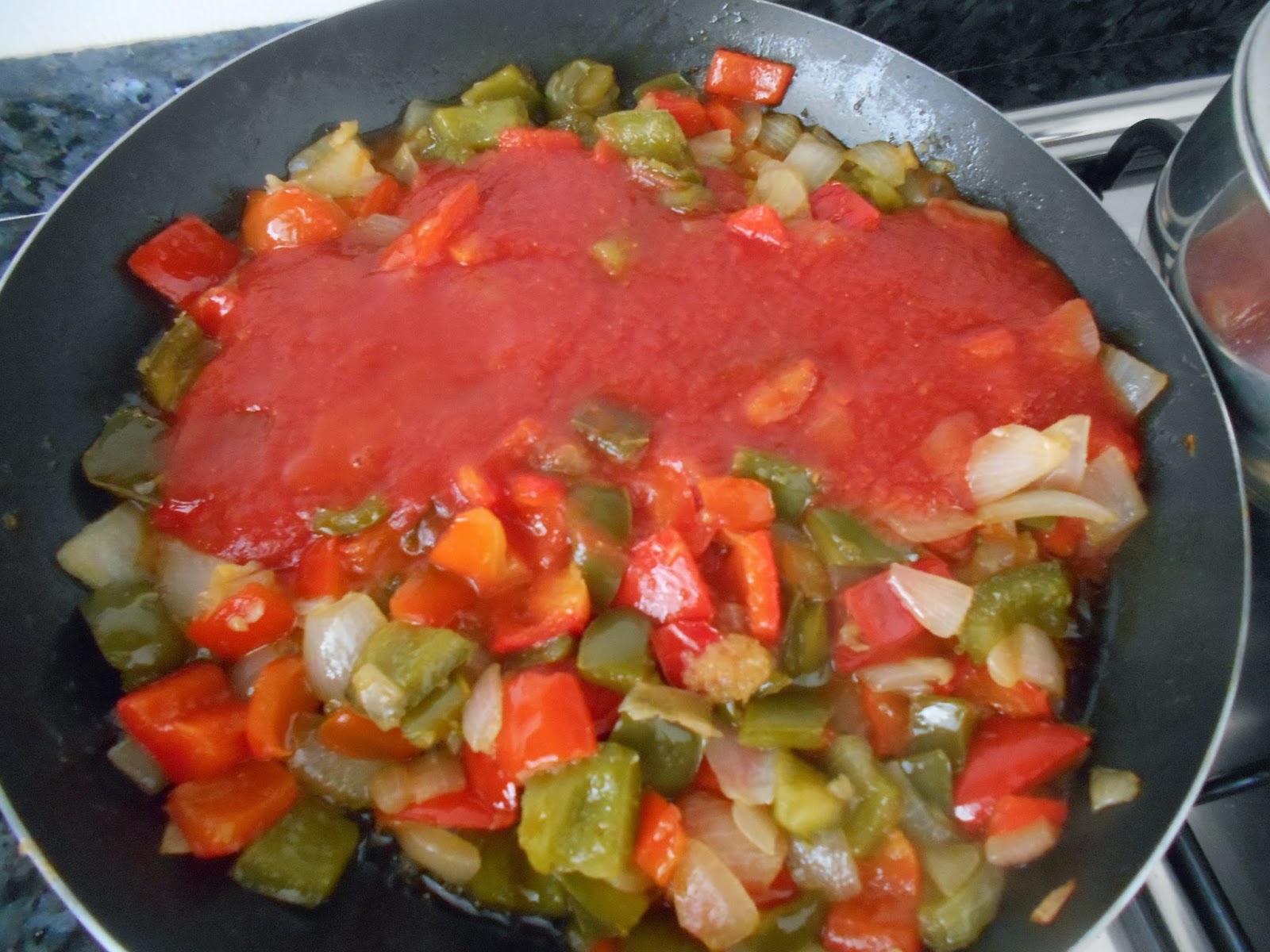 En es este instante cuando la verdura este pochada, incorporaremosel tomate a la sartén junto con una cucharadita de sal y otra de azúcar.