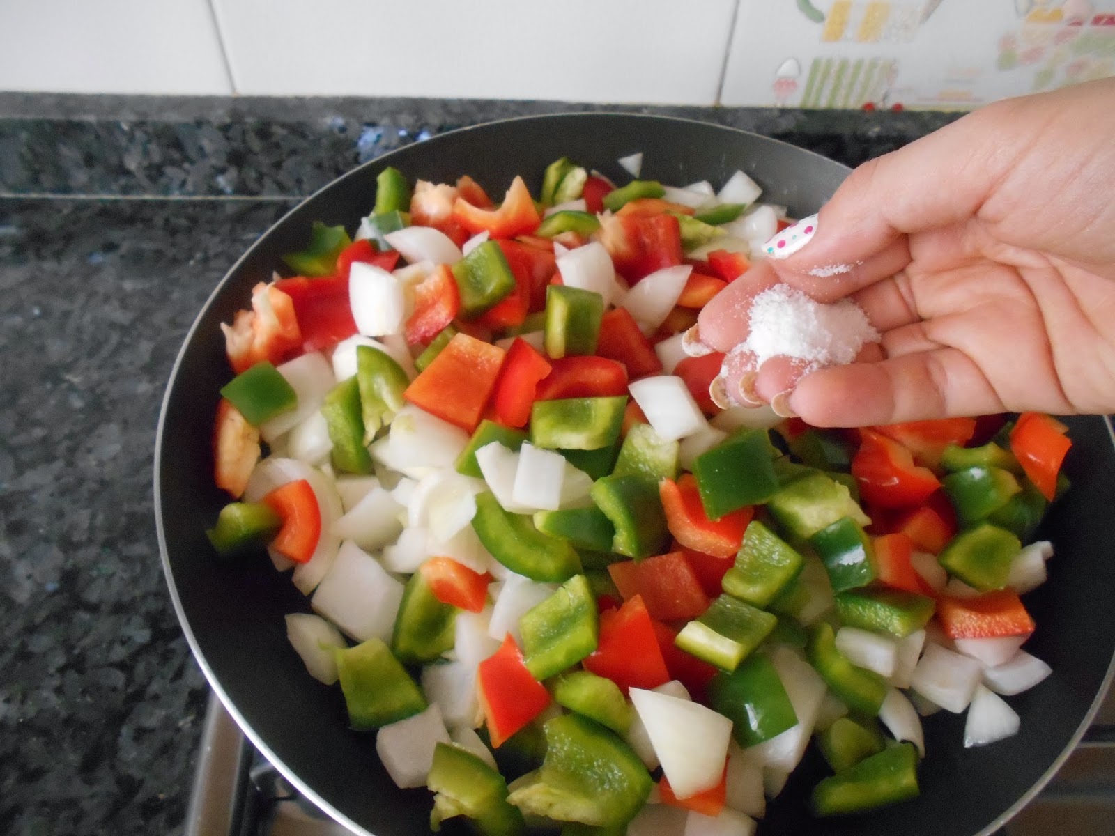Cortamos las verduras y las echamos en una sarten con aceite y con un poco de sal para que se pochen mejor y más rápido.