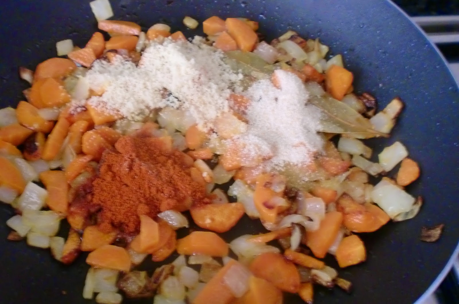 Cuando lo tengamos listo añadimos la hoja de laurel, la almendra, el pan rallado y el pimenton y sofreimos un poco.