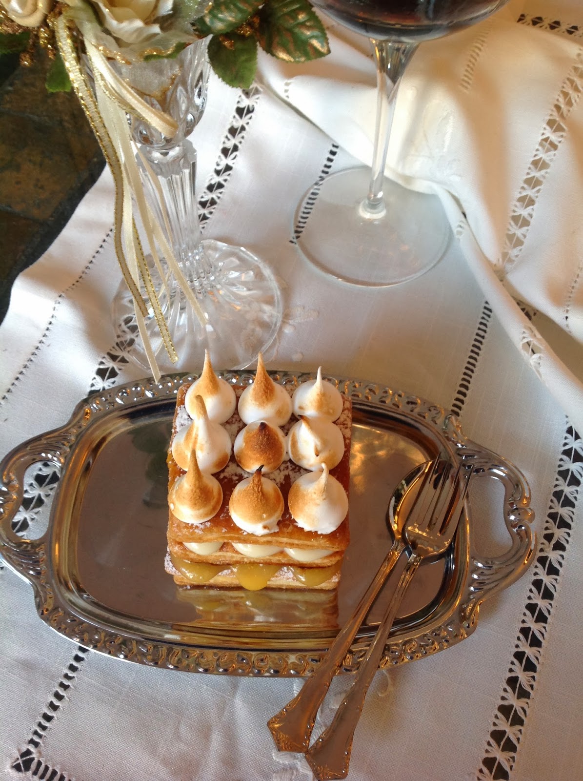 Ingredientes: Para el hojaldre invertido (harina, agua, mantequilla, sal y vinagre) para rellenar crema pastelera (leche, huevos, aromaticos) y para terminar un merengue hecho con claras