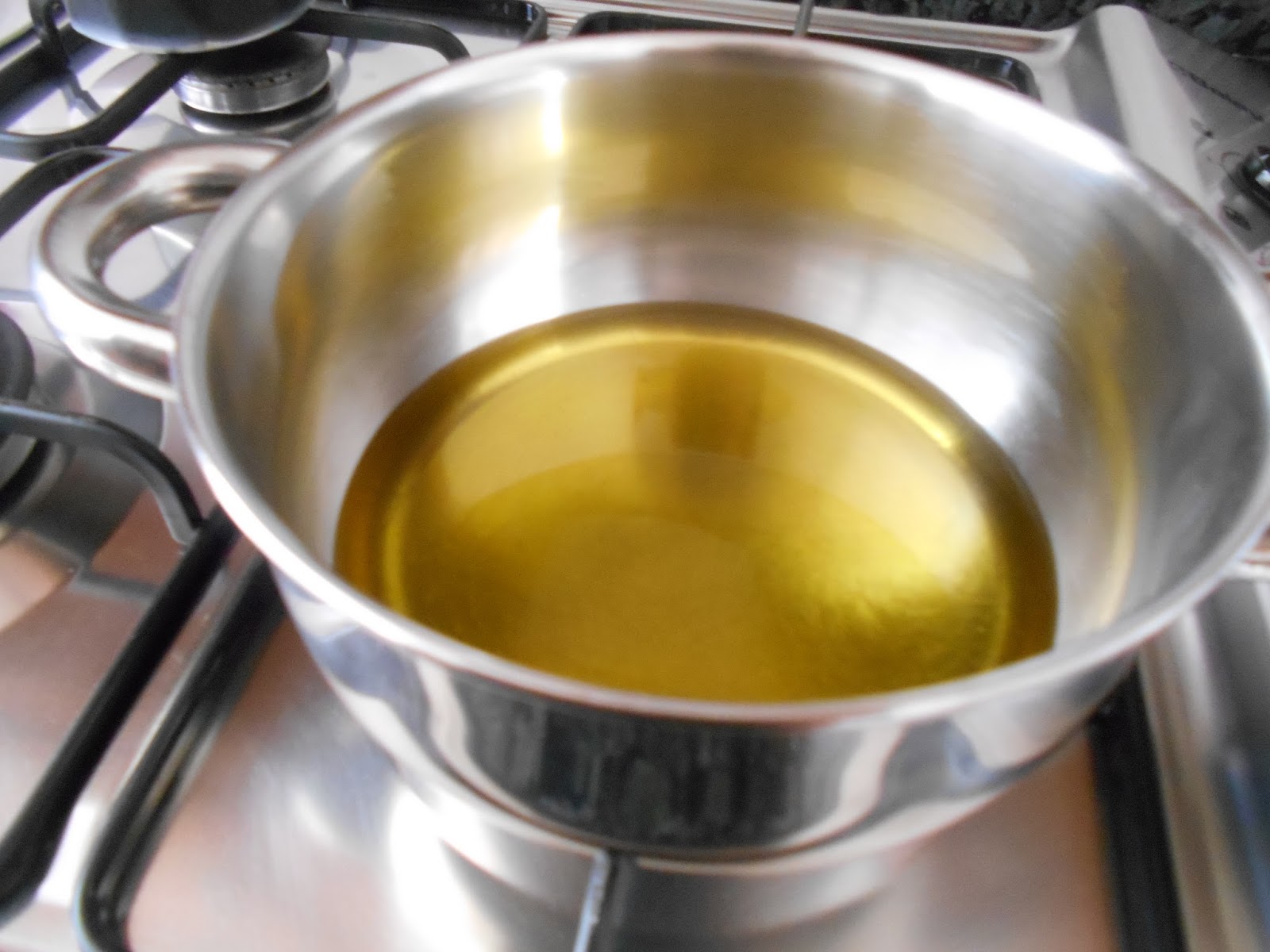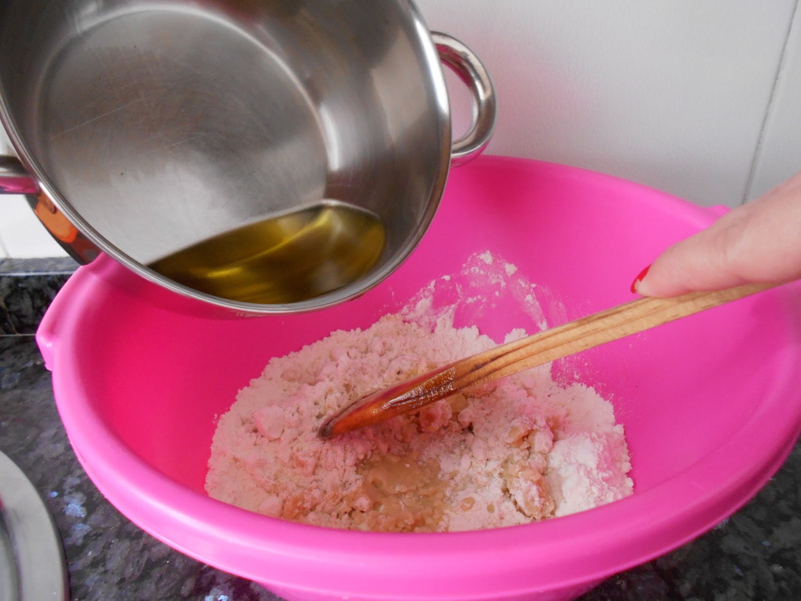Echamos la harina en un cuenco y vertemos el aceite poco a poco con una cuchara de madera.