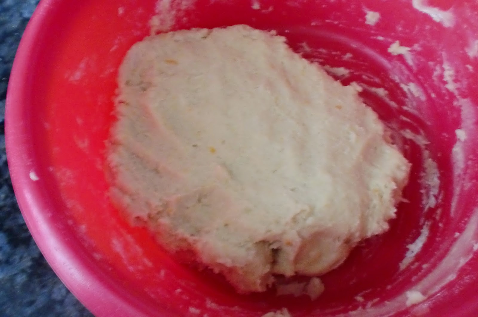 Mezclamos con la harina, tamizada, el vino, el zumo de naranja, la ralladura de naranja, amasando brevemente hasta conseguir una masa lisa.