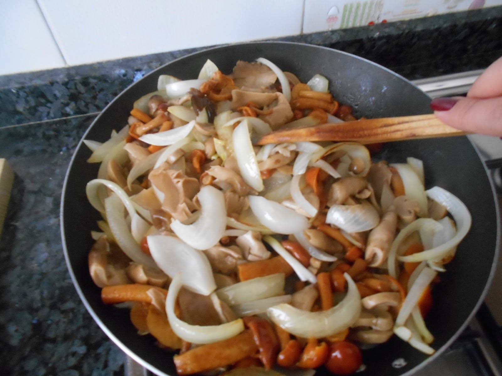 Cuando empiece a estar transparente, añadimos las setas. Salteamos todo junto unos minutos.