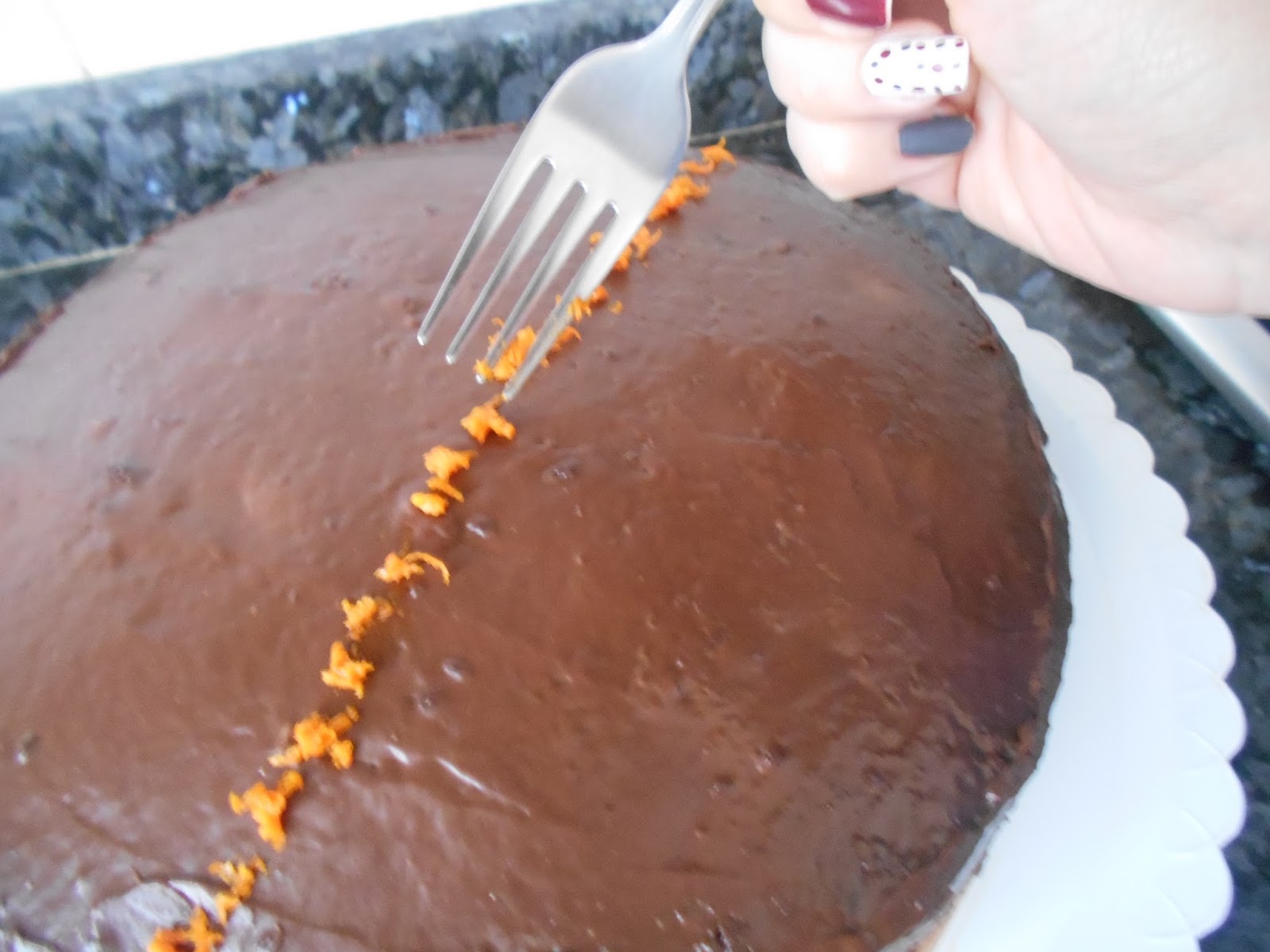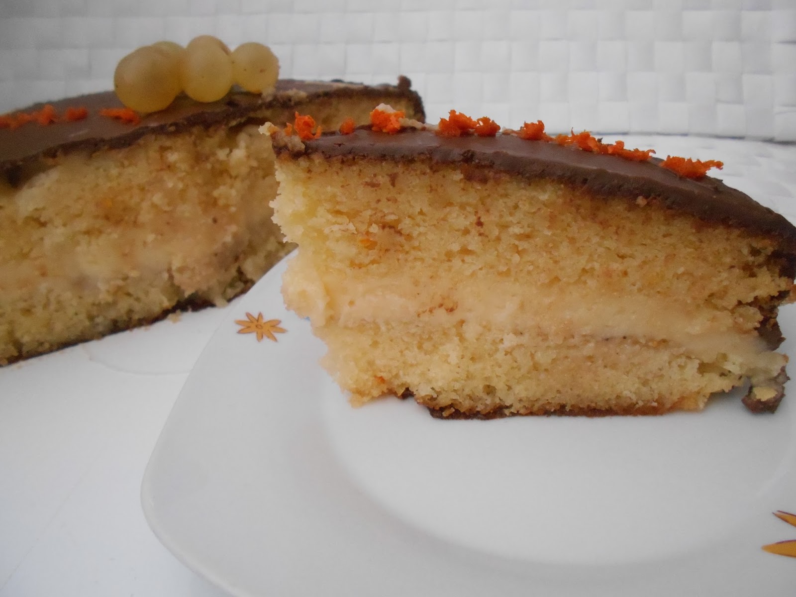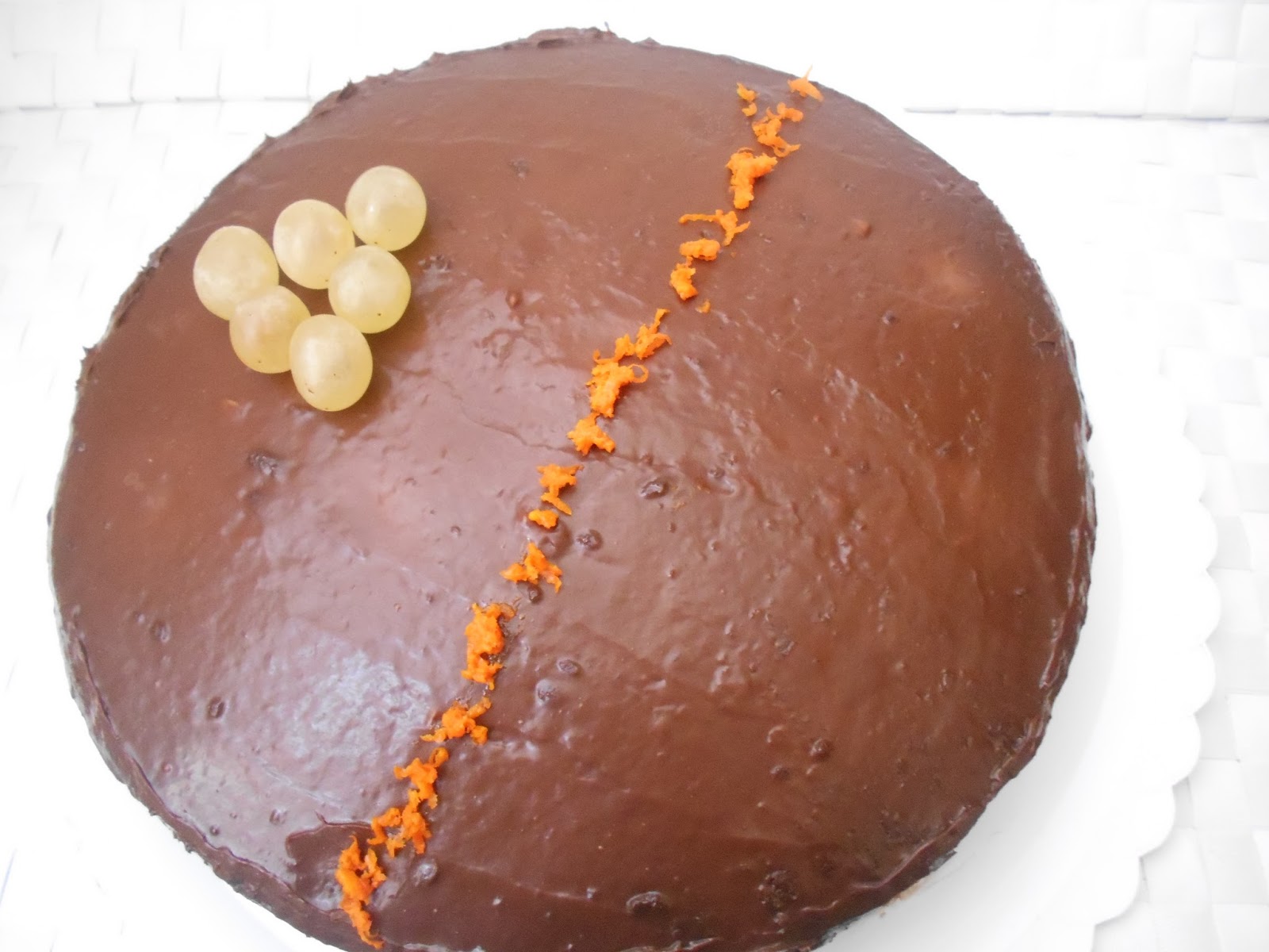 Una tarta con un bizcocho de almendras y uva, rellena de crema pastelera y cubierta de chocolate