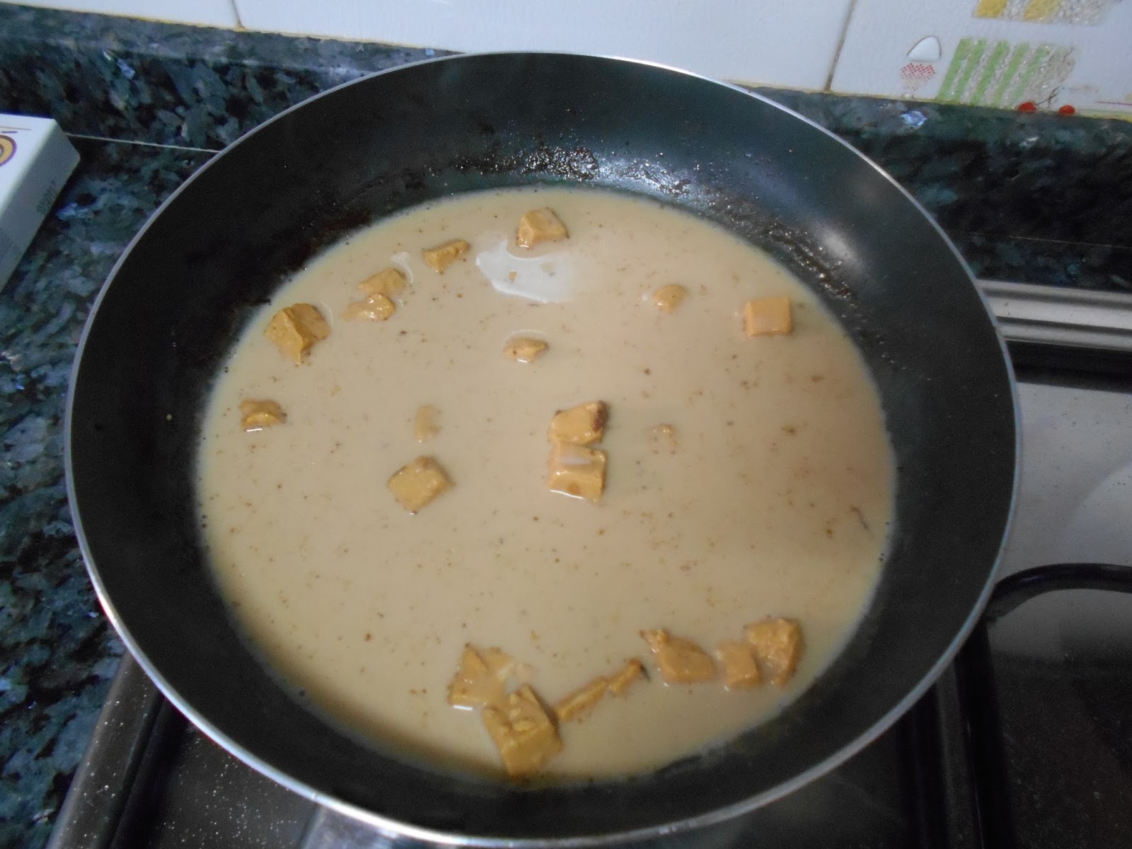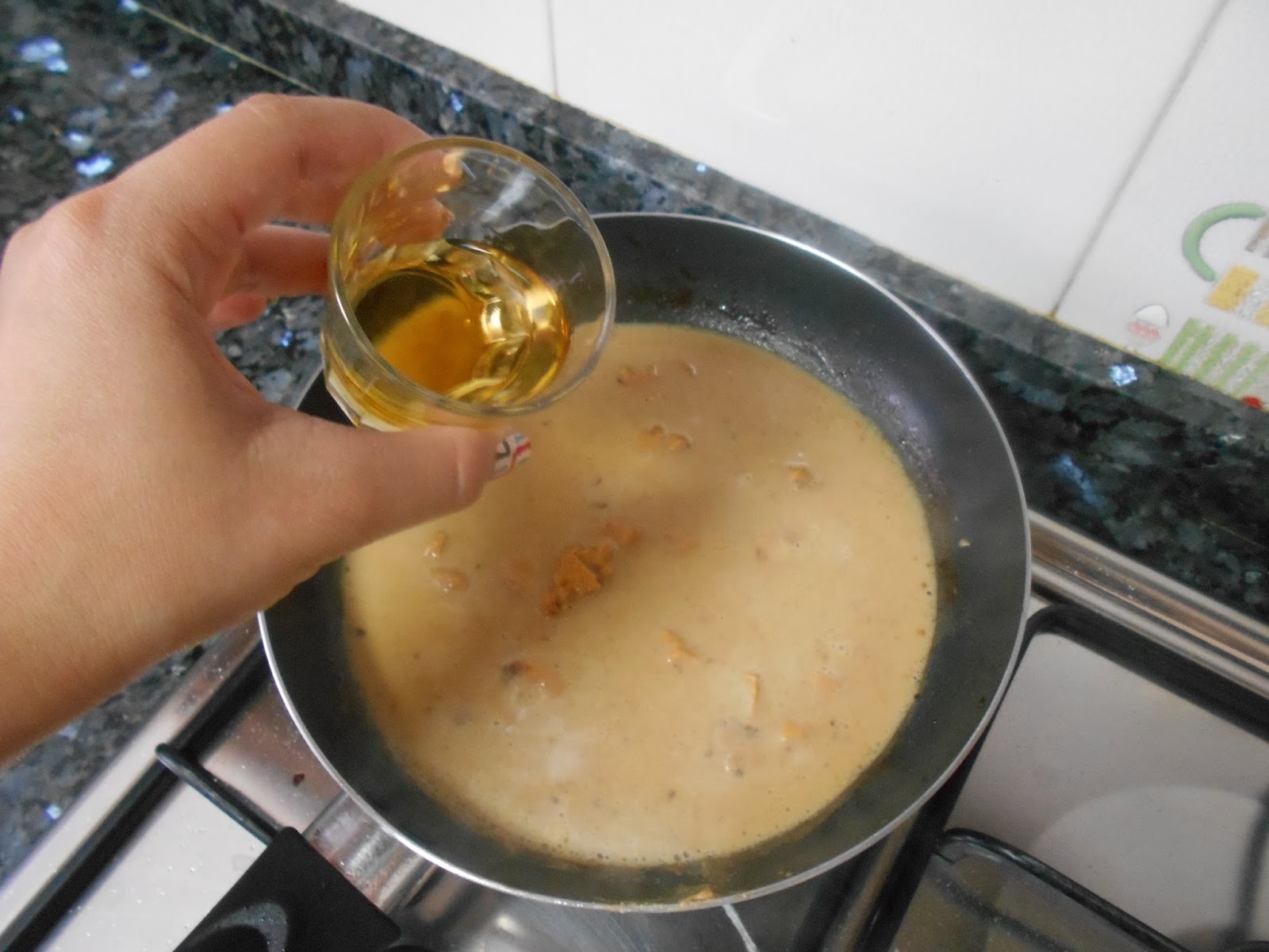 en esa misma sarten echaremos el turron picado, la leche evaporada y el whiskey.