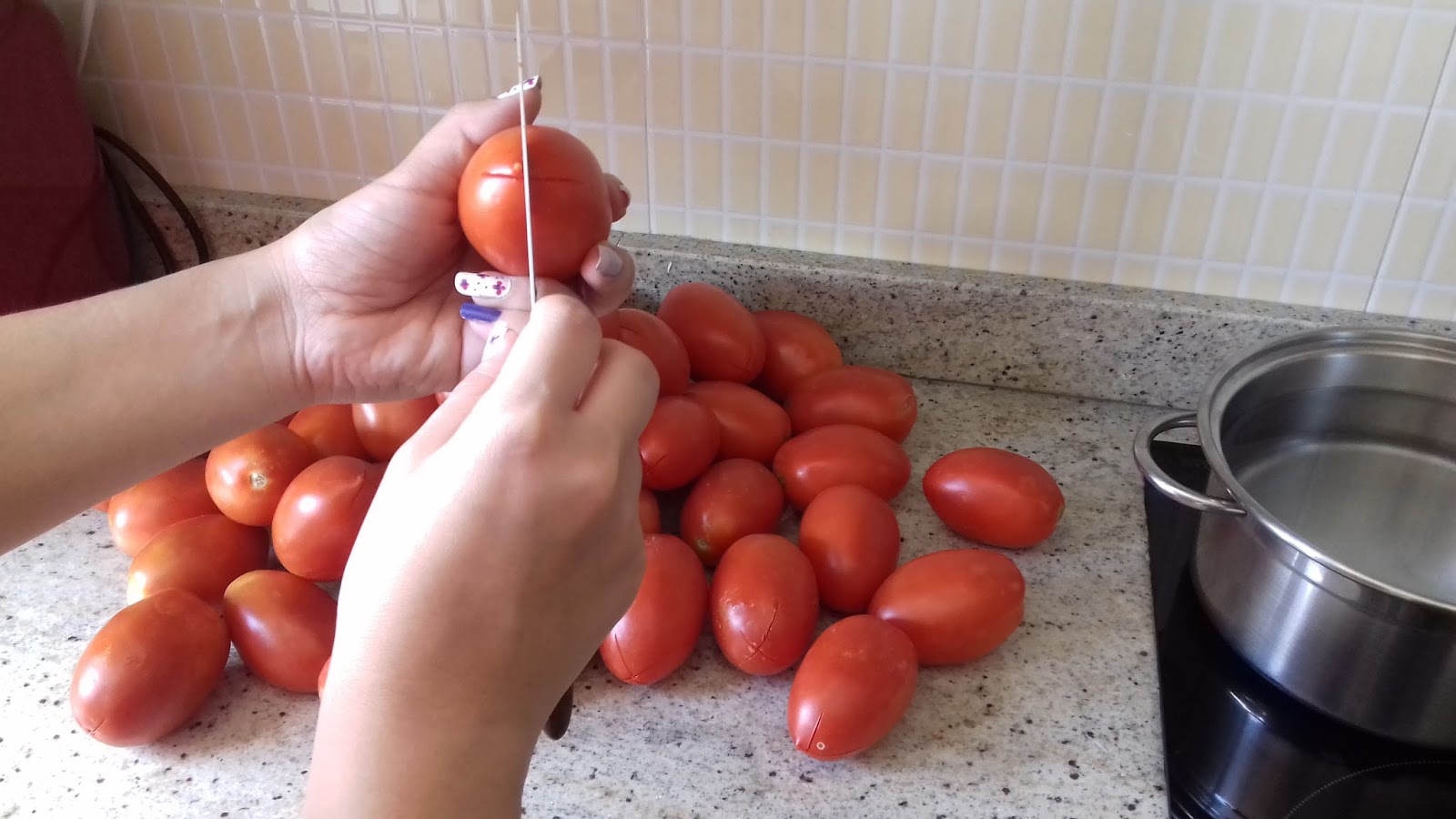 Cuando rompa a hervir (no antes) echamos los tomates y los escaldamos desde que vuelve a hervir el agua unos 5-7 min (o hasta que veáis que la piel del tomate se levanta)
