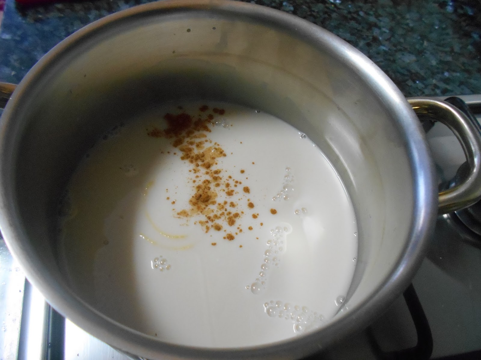 Echamos la horchata en un cazo junto con la canela y la cascara de limon, calentamos sin que llegue a hervir