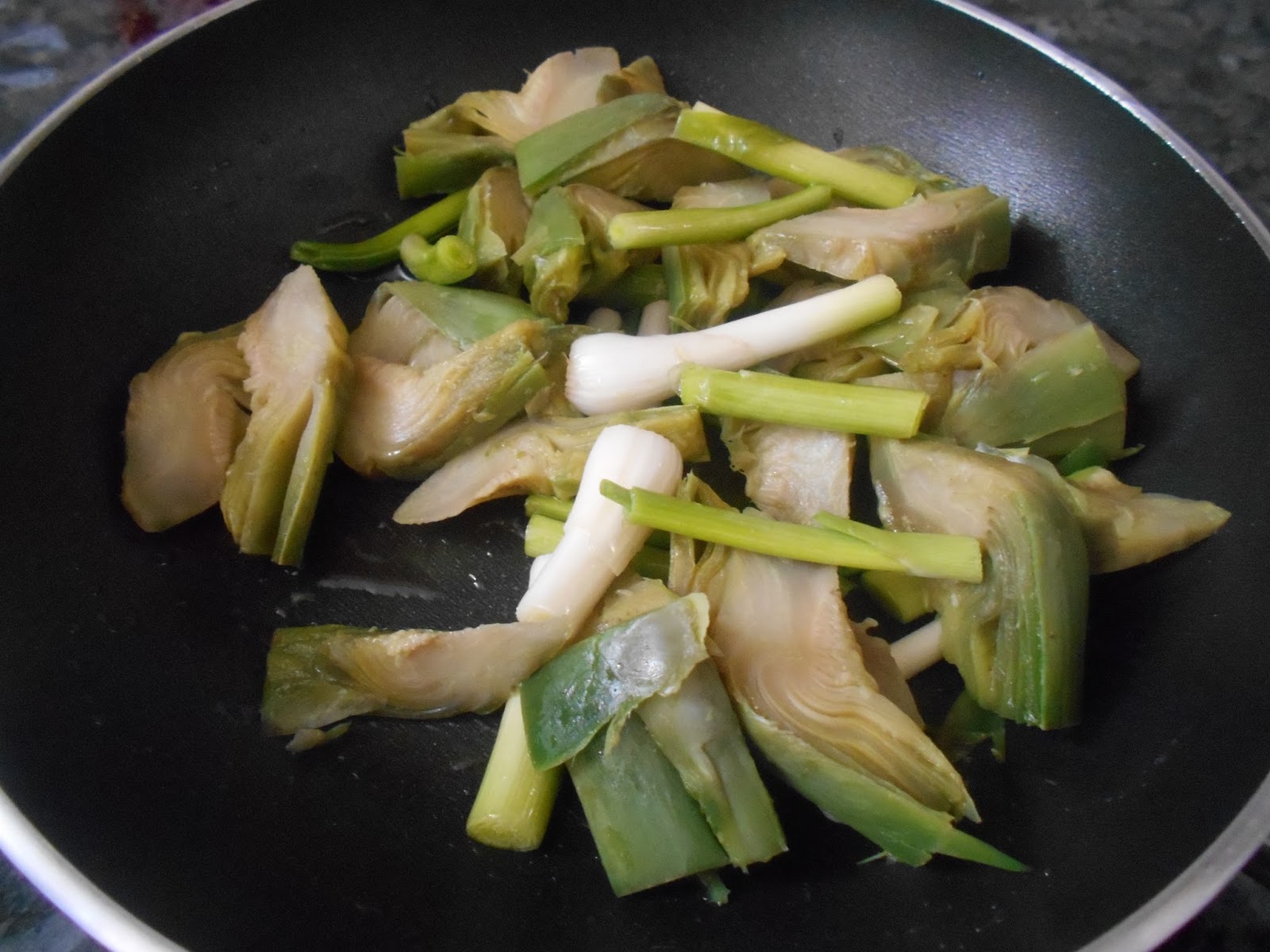 En una sarten con un poco de aceite rehogamos las alcachofas junto con los ajos tiernos limpios y cortados.