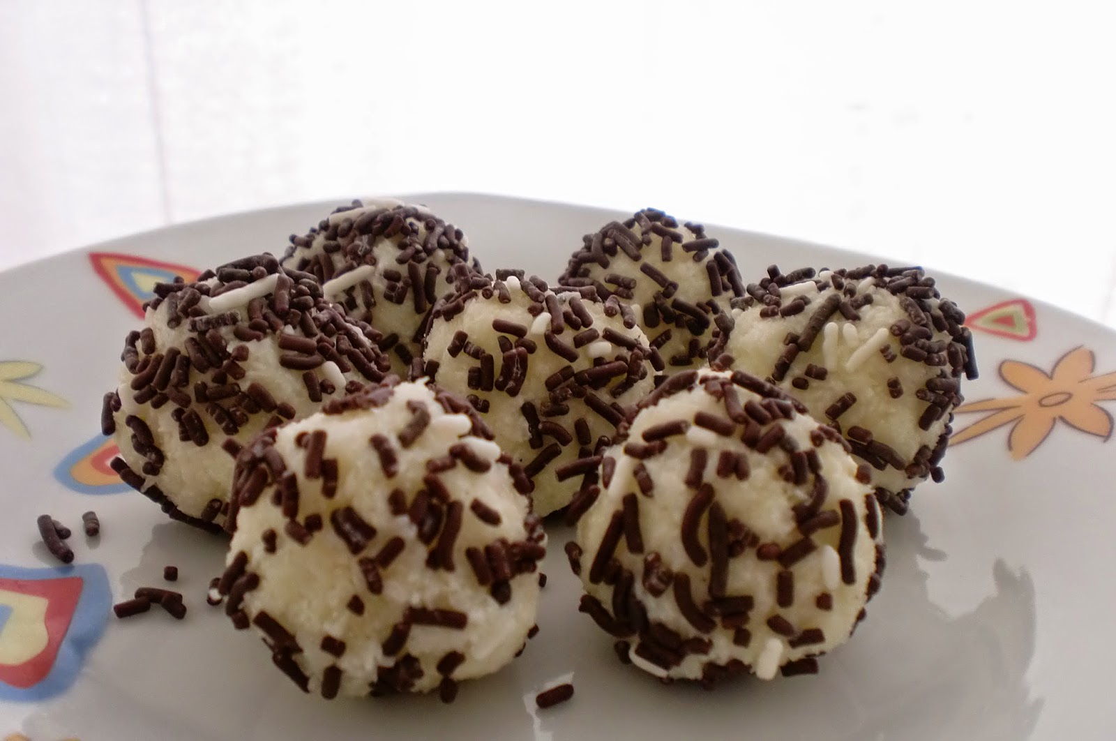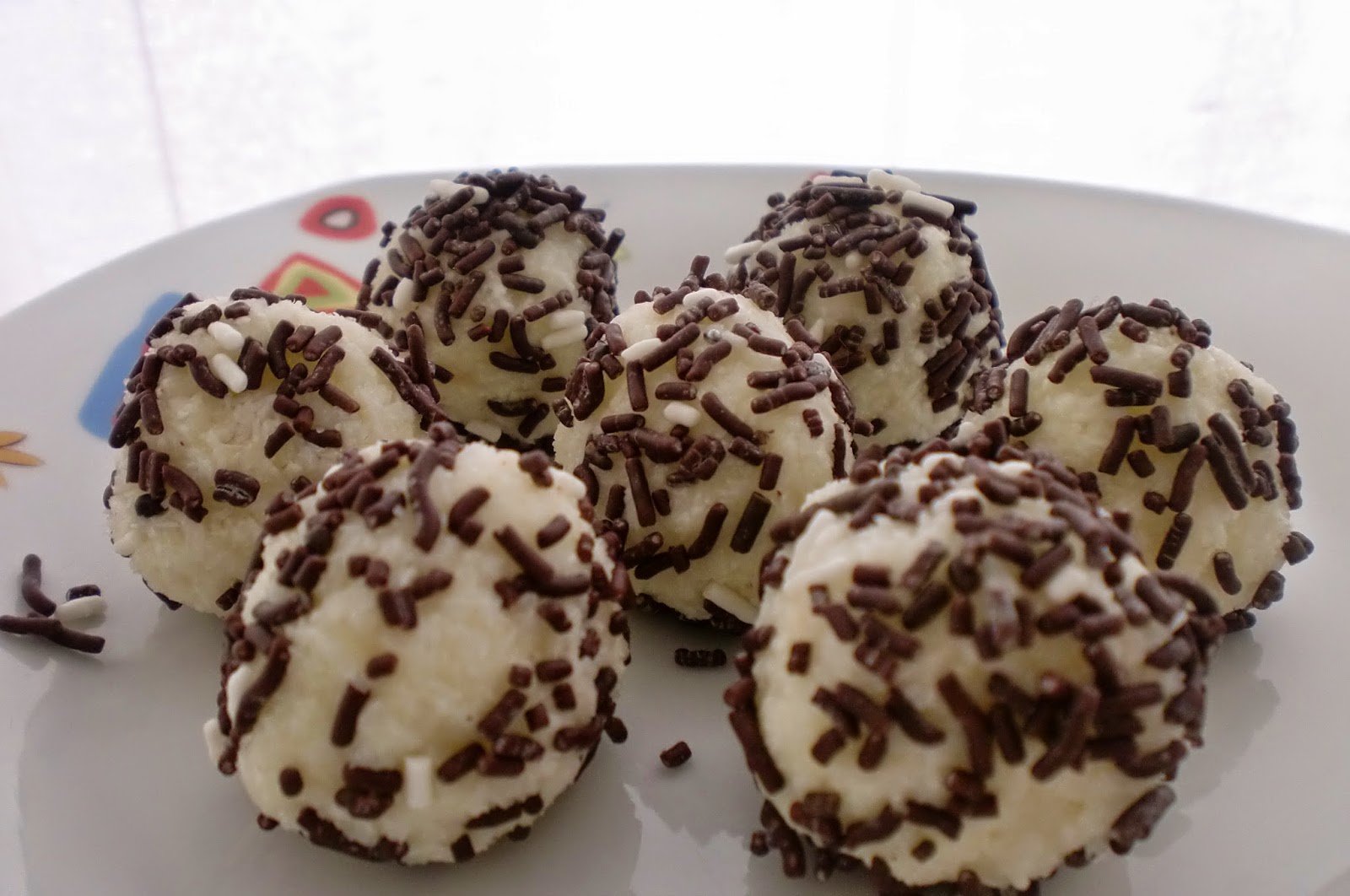 Estan hechas con mi receta de turron de coco, yo lo que hago es aprovechar del resto de masa cuando me sobra y convertirla en trufas.