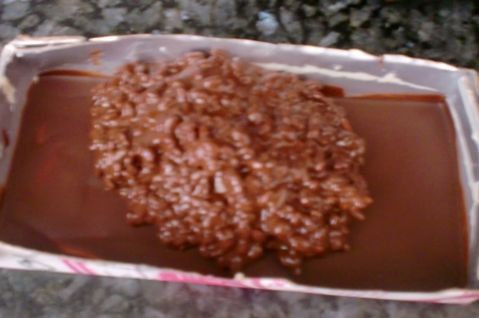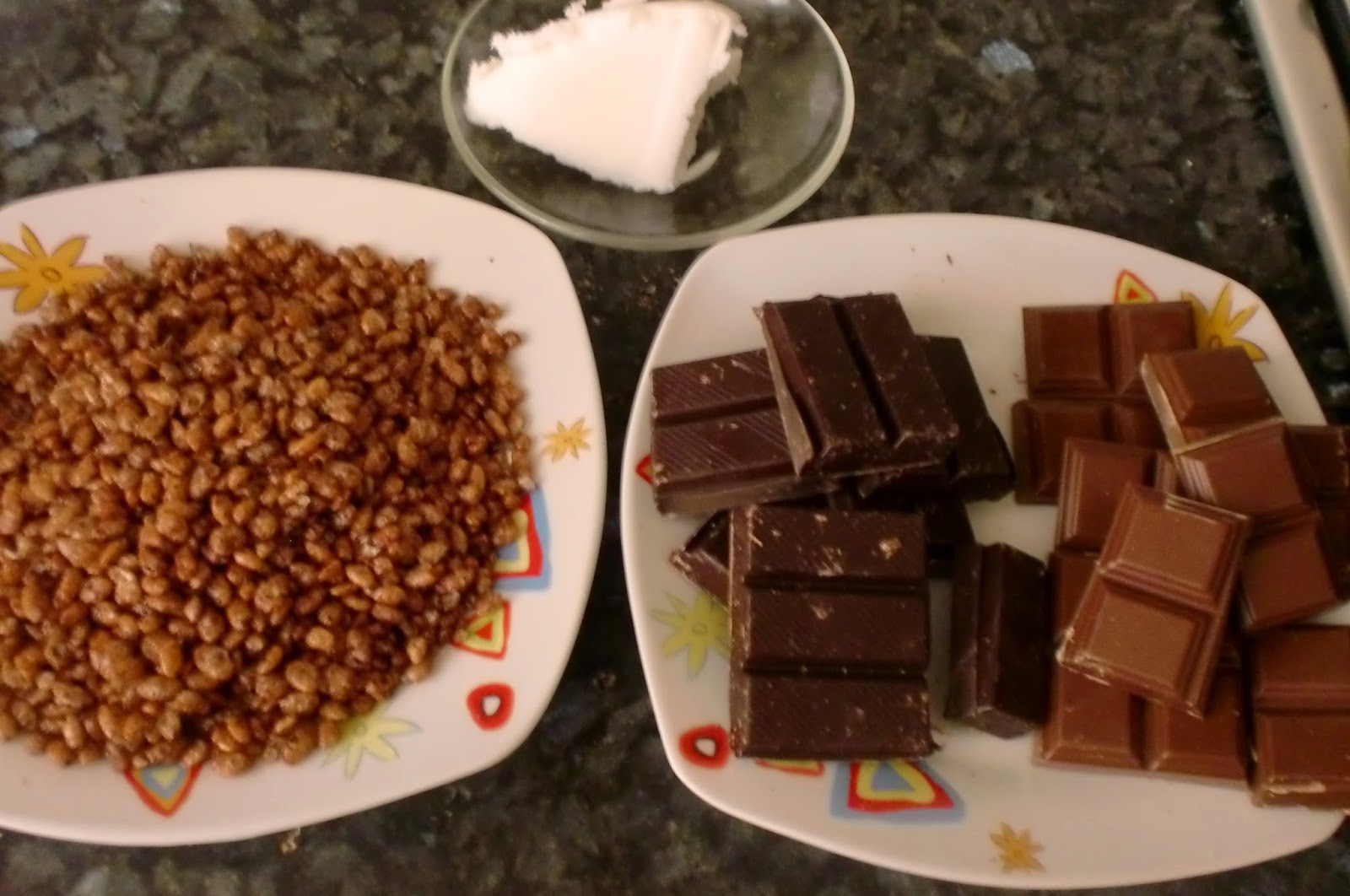 80 gr. de arroz inflado (Tipo Choco Krispies . Yo lo he comprado de Aldi el arroz inflado blanco pero podeis usar tambien chocolateado)